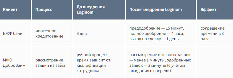 Некоторые примеры оптимизации бизнес-процессов в финтех-компаниях с помощью Loginom приведены в таблице: Отдельно рассмотрим такой критерий успешной организации процесса кредитования, как надежность. Она влияет и на внутреннюю, но в большей степени на внешнюю среду финтех-компании. Действующая система не должна допускать технических остановок или сбоев, т.к простой кредитного конвейера приводит к значительным финансовым потерям вследствие оттока клиентов из-за длительного ожидания. При этом заемщики не просто уходят, а уходят к конкурентам: каждый час простоя снижает конкурентоспособность банка, увеличивая привлекательность соперника. И это без учета репутационных потерь по причине уменьшения лояльности клиентов. Бесперебойная работа системы принятия решений — ключевое требование организации бизнес-процесса. Надежность обеспечивается как за счет автоматизации максимального количества процессов, т.е. минимизации влияния человеческого фактора, так и за счет построения устойчивой инфраструктуры. Loginom поддерживает работу в режиме отказоустойчивого кластера, что обеспечивает функционирование системы принятия решений без остановок или сбоев. Loginom — универсальная платформа, поэтому эффект от её применения не ограничивается только системой принятия решений о выдаче кредитов. Существует дополнительные «фишки», с помощью которых платформа обеспечивает принятие обоснованных решений: Loginom можно применять для самостоятельной реализации логики или воспользоваться готовыми прикладными решениями на базе платформы: Резюмируем, какие преимущества дает Loginom как low-code продукт: За время работы Loginom Company наши продукты были внедрены более чем в 20 банках и МФО. Среди клиентов такие компании как Росбанк Дом, БЖФ Банк, МигКредит, Банк Россия, СКБ Банк, ВТБ Лизинг, Квантмобайл банк и т.д. Например, с помощью low-code платформы Loginom: В реалиях 2022 года, многие финтех-компании вынуждены приспосабливаться к уходу практически всех зарубежных вендоров программных продуктов. Loginom — 100% российская разработка, входит в Единый реестр отечественного ПО, на работу платформы и решений санкции никак не повлияют. Если вы хотите внедрить продукты Loginom для финтех-сегмента, свяжитесь с нами.