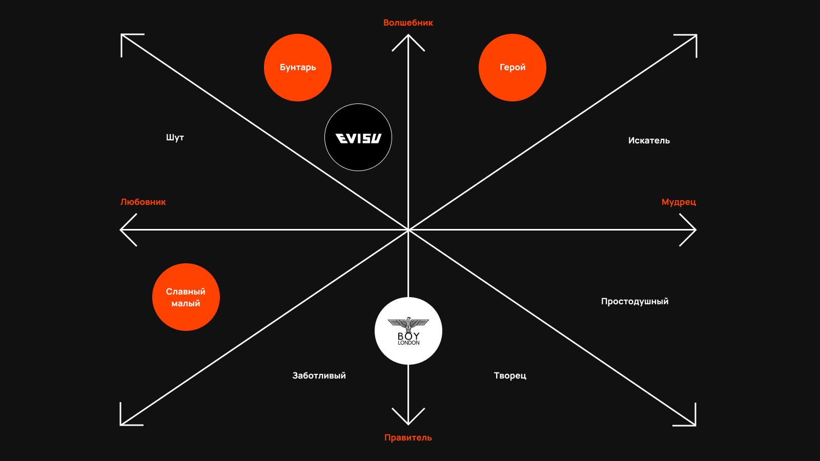 Всего архетипов бренда 12, как и было в изначальной теории Юнга. У каждого из них есть базовая потребность, которую стремится удовлетворить архетип, ценности, стремления и цель. Проблема применения теории в брендинге состоит в том, что многие названия переведены в разных источниках по-разному: «герой» везде «герой», а вот «славный малый» может переводиться как «свой парень» или «сирота». Лучше ориентироваться на английские названия, особенно если компания планирует выход на международный рынок. Выбрать архетип бренда, с помощью которого компания разработает правильное позиционирование, предпринимателю помогут простые вопросы. Они обычно включены в бриф брендингового агентства. Какой у бренда характер? Как бы вы описали его, будь он человеком? Может быть, ваш бренд — яркий экстраверт, который заряжает энергией окружающих? Или спокойный, уравновешенный интроверт, для которого важны рациональность и внимание к деталям. Какие чувства испытывает человек, когда взаимодействует с продуктом бренда? Продукт может вызывать чувство спокойствия и безопасности или, наоборот, возбуждать, призывать к действию. В каких ситуациях используется продукт? Продукт может настраивать на рабочий лад или расслаблять, спасать от грусти или заставлять задуматься о вечном. Как описывает бренд потребитель? Чтобы ответить на последний вопрос, нужно провести дополнительное исследование: например, опрос или фокус-группу. Ещё одно исследование должно касаться конкурентов. Обычно анализируется около трёх компаний и определяются их архетипы. После этого компания должна принять решение: отстраиваться от конкурентов или выбрать тот же путь. Выбор зависит от смелости команды и самого бренда. У большинства брендов выделить архетип в чистом виде сложно, обычно он составной: ключевой архетип плюс дополнительный. Можно выбрать и три, но тогда есть шанс потерять посыл. Например, у Adrenaline Rush можно определить архетип как герой и бунтарь: ценится смелость, сила и стремление выделяться — составляющие двух архетипов. Выбор архетипа — это всегда гипотеза, которая может подтвердиться, а может и нет. Если подготовительный этап с анализом потребителей и конкурентов проводится качественно, возрастает вероятность того, что архетип «приживётся». Проверяется гипотеза уже на практике. Процесс выбора архетипа лучше разбирать на реальном примере. Пару месяцев назад в Логомашину обратились основатели проекта Malign — магазина oversize-футболок и худи с дерзкими принтами, который готовится покорить молодёжь Китая. Перед командой стояла задача создать полноценный бренд: выбрать архетип, сформулировать позиционирование и стратегию, разработать визуальную идентичность. Название магазина переводится как «поднимать на смех»: оно отражает дерзость проекта. Главная цель Malign — выделиться на фоне других брендов. При контакте с ним покупатель должен чувствовать себя особенным, выделяющимся из толпы. Команда маркетологов проанализировала коммуникацию и позиционирование всех заметных игроков на рынке и выяснила, что большинство из них используют три архетипа: правитель, бунтарь и искатель. Например, Supreme — искатель, Evisy — бунтарь, а Boy London — правитель. Здесь возможно два варианта: вы можете пойти уже протоптанной дорожкой или, как это сделал Malign, идти против всех и выбрать что-то со