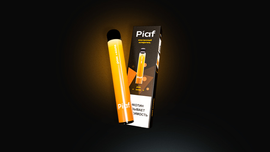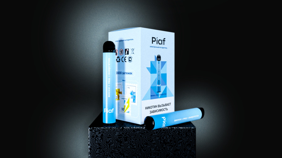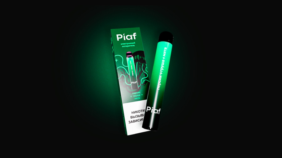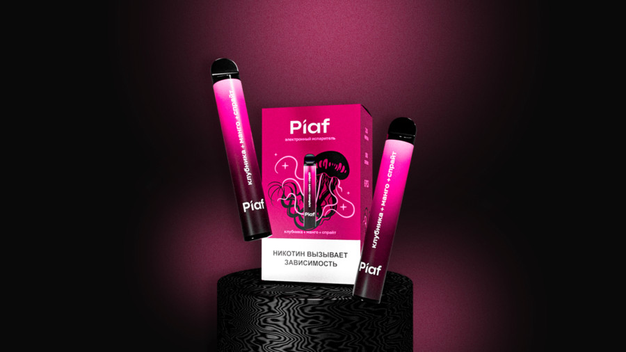 Кроме того, название созвучно с английским словом puff, которое переводится как «пыхтеть». Fumehit — неологизм, который образован от двух английских слов: fume — «дым» и hit — «успех, удача». «Дымный успех» вызывает ассоциации с престижем и статусом, который приобретает человек вместе с электронной сигаретой. Pipe переводится с английского как «трубка». Курительная трубка — это элемент элитного способа потребления табака, он такой же долговечный, как и электронные сигареты нашего клиента. Sloud — неологизм, который образован от двух английских слов: sweet — «сладкий» и cloud — «облако». Название ассоциируется с процессом курения электронных сигарет — вдыхаешь фруктовый пар и выдыхаешь сладкое облако. Кроме того, в названии мы заложили похожее по написанию слово slow, которое переводится как «медленный», что подчёркивает долговечность сигареты. В итоге остановились на названии Piaf: оно наиболее точно передаёт настроение вечернего отдыха, а также компактно размещается на самой электронной сигарете. Человек, который выбирает для курения электронную сигарету, особое внимание уделяет степени яркости её вкуса. Айдентику Piaf мы решили наполнить обилием цветов и образов, привлекающих внимание любителей подымить. Вдохновение к нам пришло, откуда не ждали — из космоса. В фирменном стиле мы использовали образы небесных тел, чтобы показать запредельность и фантастичность эмоций человека, который использует сигареты Piaf. У логотипа каждой компании должно быть «главное место» — там, где его наиболее часто видит потребитель: например, у Apple — техника, у Авиасейлс — сайт. У Piaf «главное место» логотипа — электронная сигарета и упаковка. Логотип со знаком, размещённый на сигарете цилиндрической формы, может потерять свою узнаваемость: его не будет видно полностью. Поэтому мы предложили Piaf шрифтовой лого. В основу шрифта лёг минималистичный Syne, но в процессе работы мы его кастомизировали: вручную изменили нескольких букв, а «i» сделали в виде самой сигареты. В основе фирменной палитры лежит образ ночного неба: яркие зелёные, фиолетовые и голубые элементы акцентно выделяются на глубоком чёрном фоне. Для команды Piaf мы оставили свободу в выборе цветов для брендирования носителей: в фирменном стиле нет жёстких ограничений, поэтому цвет электронных сигарет может быть абсолютно любым. Производители электронных сигарет размещают много информации на упаковках: состав, способ хранения и технические характеристики товара. Текст должен легко читаться, поэтому в качестве фирменного шрифта мы выбрали аккуратный Golos. Паттерн — это узор из повторяющихся элементов, который помогает сделать фирменный стиль компании узнаваемым. Паттерны часто служат фоновым рисунком на упаковках, баннерах, форме сотрудников и дополняют основной дизайн. Обычно компании разрабатывают один паттерн и делают его в нескольких цветовых решениях, чтобы узор не выглядел скучно и однотипно на всех носителях. Мы сделали для Piaf сразу два, чтобы компания могла использовать их для разных линеек продукции и выделяться ярким дизайном на фоне конкурентов. Первый паттерн мы назвали «медуза», а второй — «марки». При разработке первого паттерна мы вдохновлялись струями сигаретного дыма: они напомнили нам щупальцы медузы, которые постоянно двигаются в толще воды. Чтобы образ не выбивался из общей к