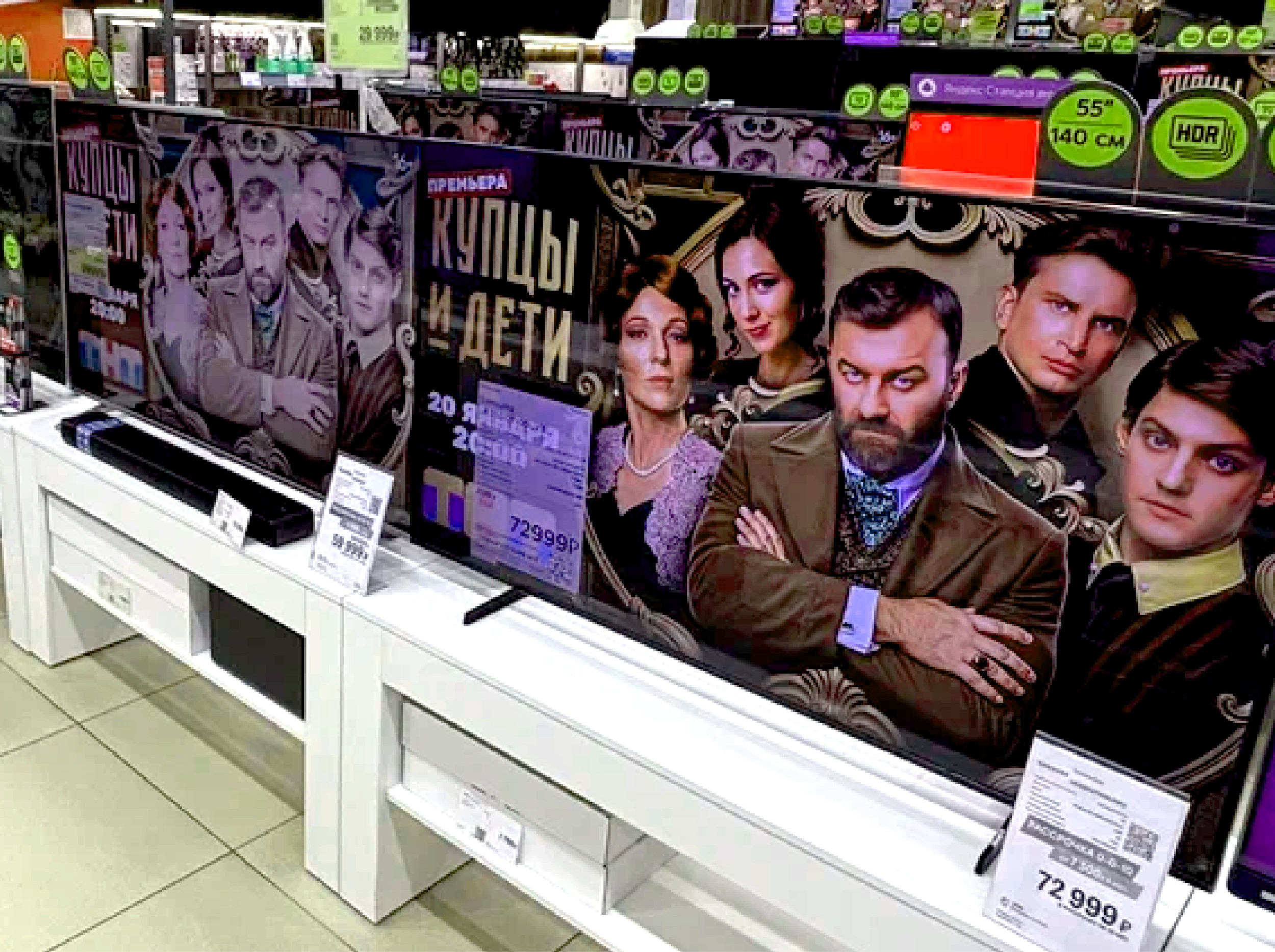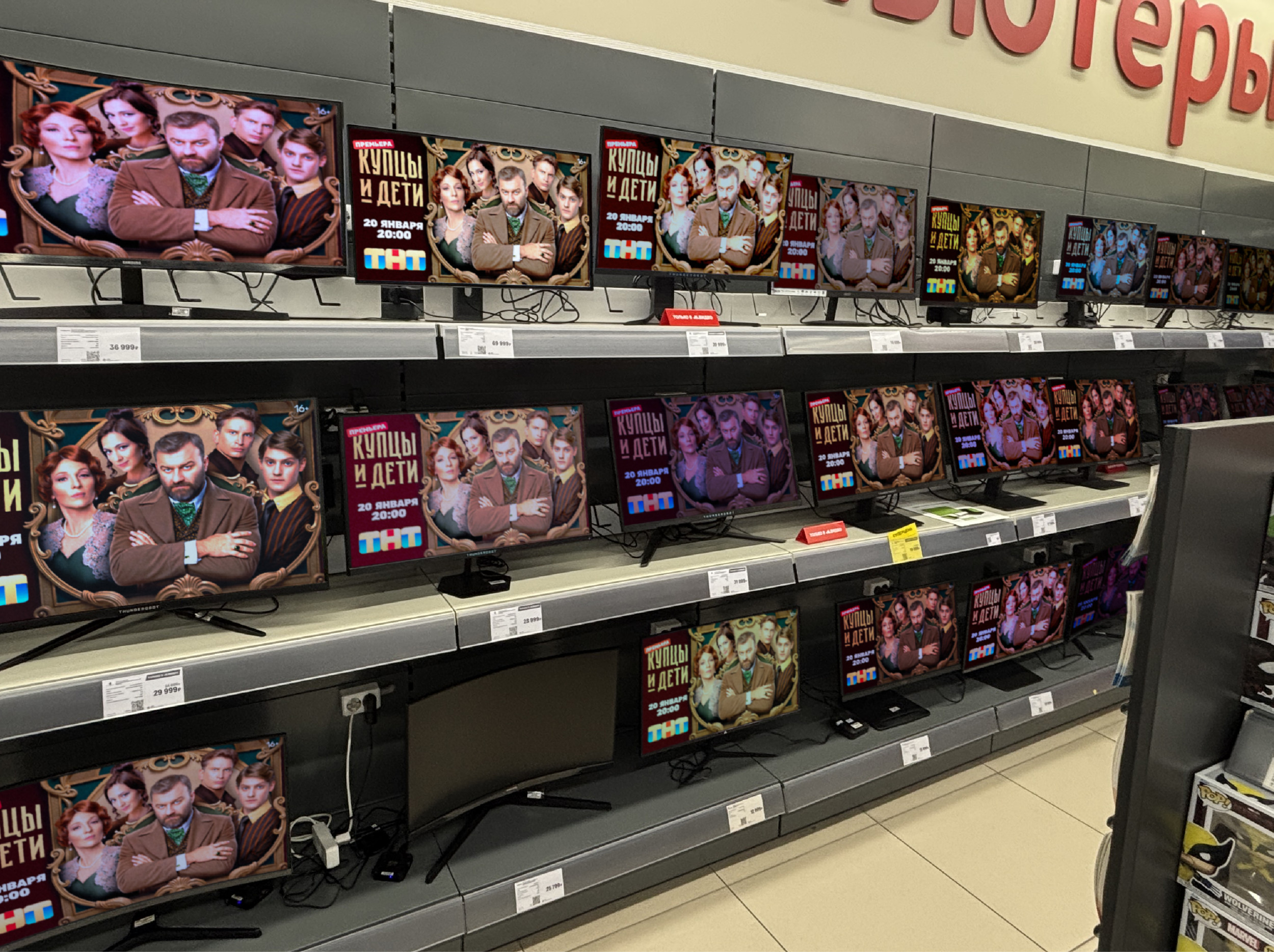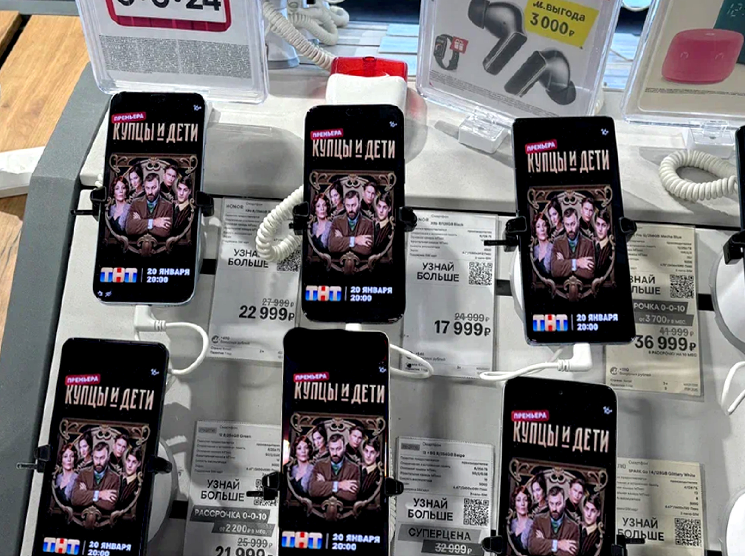 В М.Видео-Эльдорадо протестировали два формата размещения. Первый — экраны внутри торгового зала, второй — каскадное размещение ролика на всех видеоносителях в локации: телевизорах, мониторах, ноутбуках, планшетах, смартфонах, которые объединены в единую медиасеть, что позволило получить более 200 единиц рекламного инвентаря внутри торговой точки, работающего одновременно. Во всех возрастных группах более 90% опрошенных обратили внимание на рекламу сериала. Это подтвердило релевантность и эффективность данного канала. Дополнительный эффект оказала актуальность транслируемого контента — полное попадание в ядро аудитории. Примечательно, что разные возрастные и соцдем-группы реагировали на различные носители. Представители молодежи отмечали, что сначала обратили внимание на рекламный ролик на планшетах и смартфонах, потом увидели остальные носители. Мужчины среднего возраста в большей степени реагировали на мониторы и ноутбуки. Женщины среднего возраста и представители групп 45-55 и 55+ обращали внимание сначала на ТВ, после — на все остальные носители.