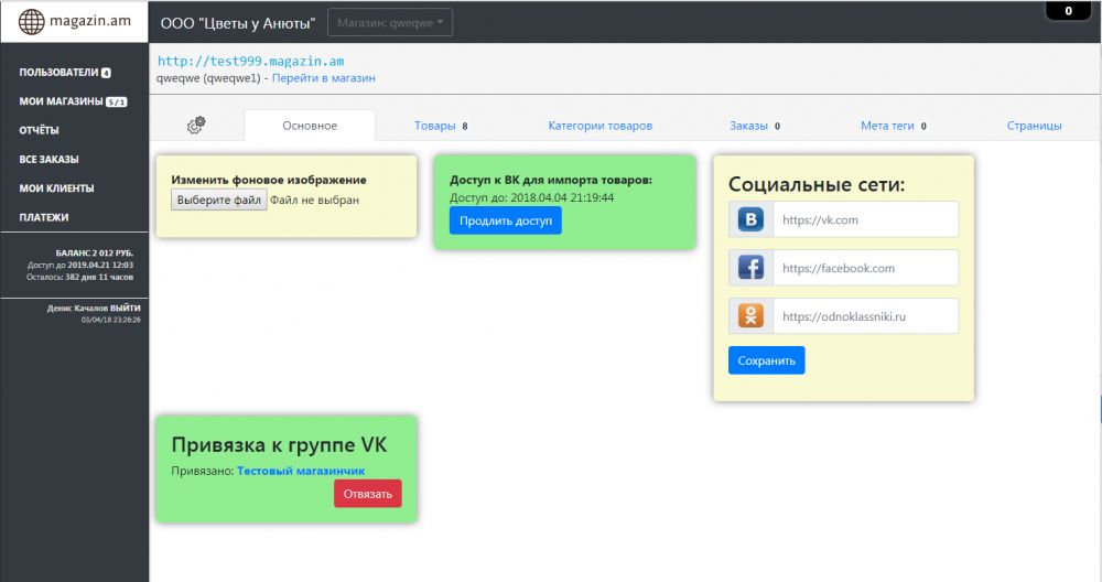Поставлена задача лёгкого импорта и экспорта товаров в группу VK и эту задачу мы решили. Если у пользователя есть группа в вк наполненная товарами то можно легко и просто импортировать товар в нашу систему. Затем можно внести правки например в описание и так же легко экспортировать новые данные обратно в группу или же привязать к магазину другую пустую группу и наполнить товаром уже её.