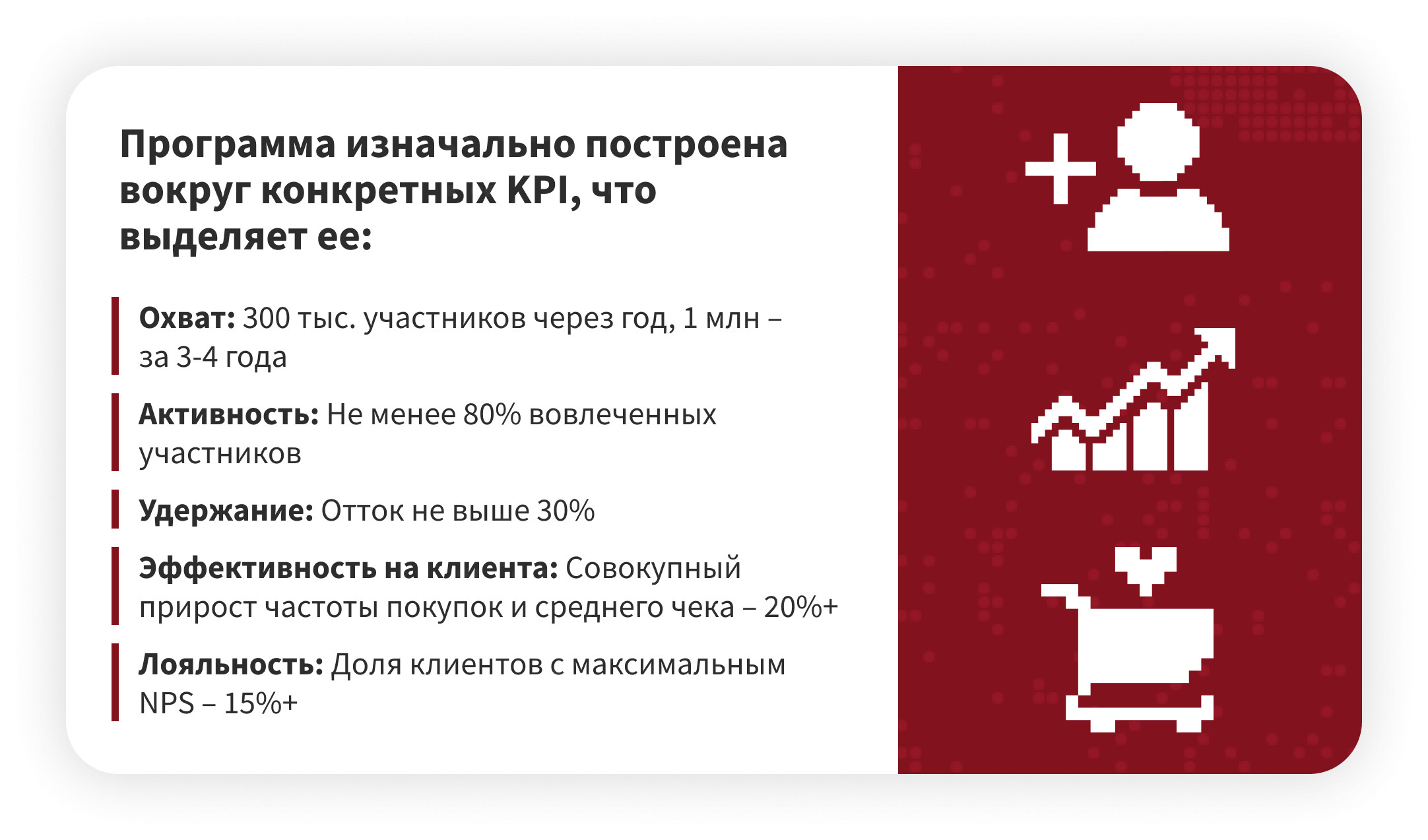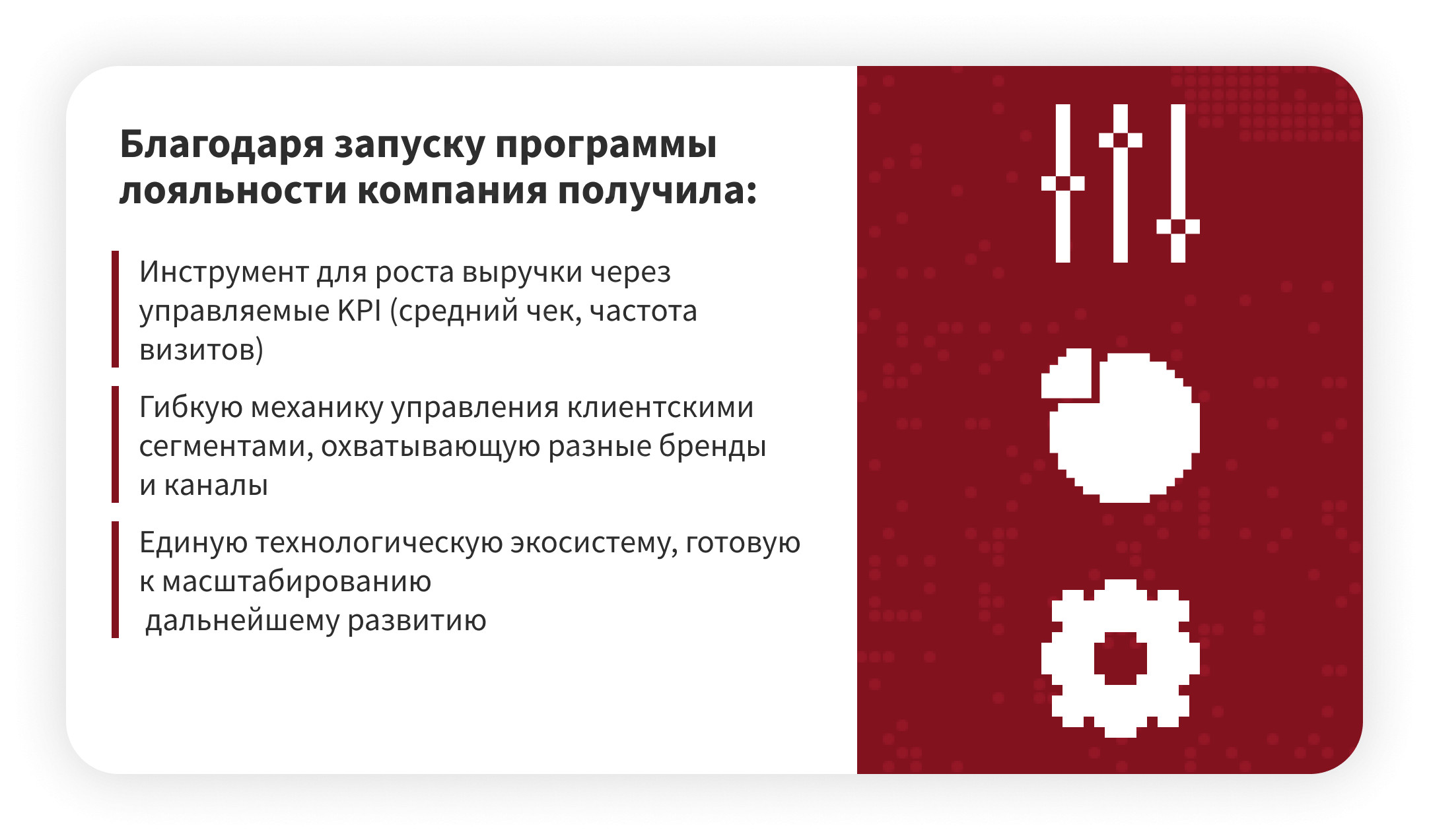 Цель проекта по запуску программы лояльности была четкой и прикладной: объединить разные каналы продаж, разрозненные механики лояльности, которые работали у брендов, в единую экосистему для повышения покупательской активности (средний чек, частота покупок) и построения долгосрочных отношений с покупателями.