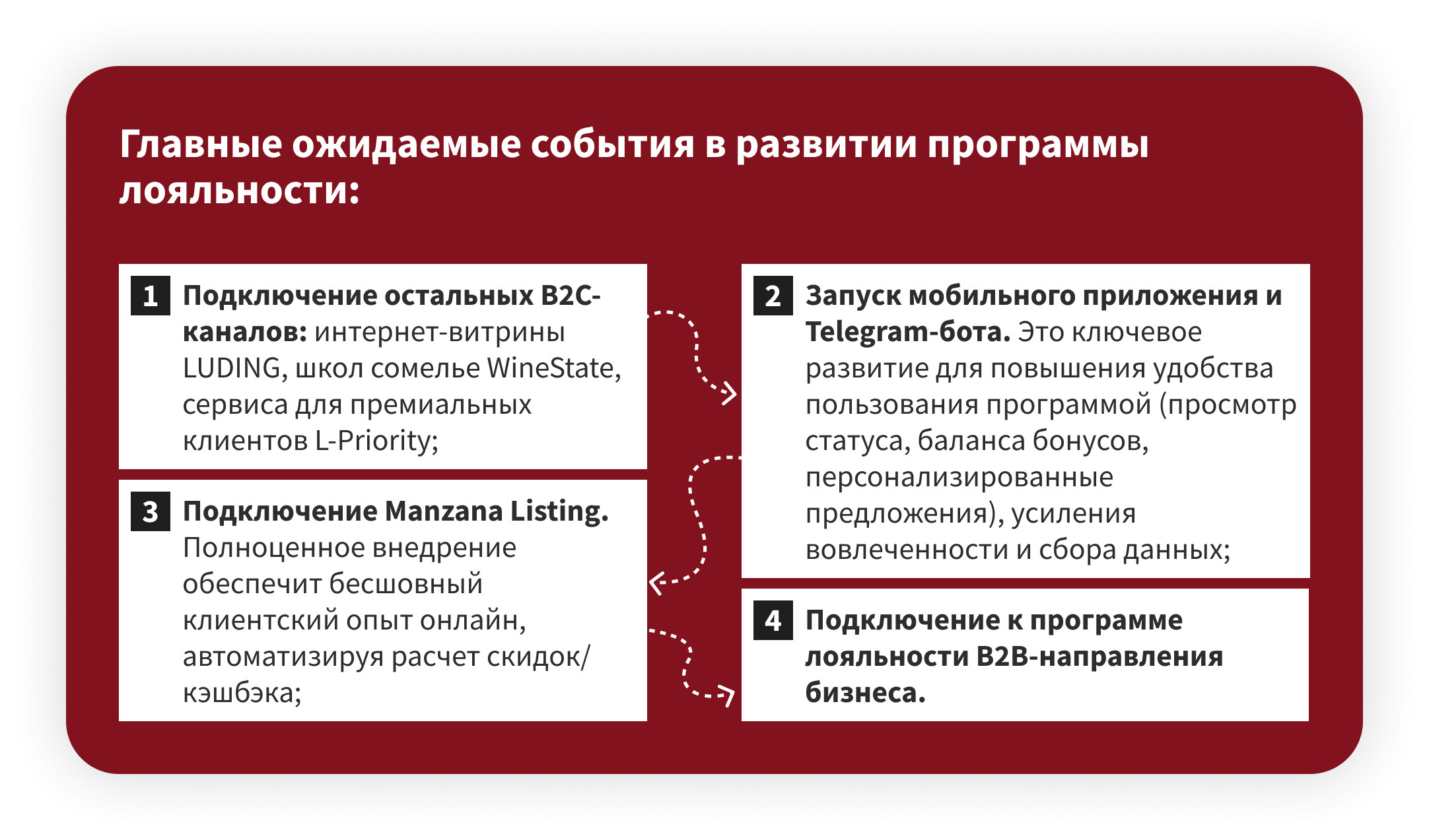- Этапность и дисциплина: Внедрение проходит через последовательные этапы. Сейчас программа лояльности запущена в винотеках Drinx.