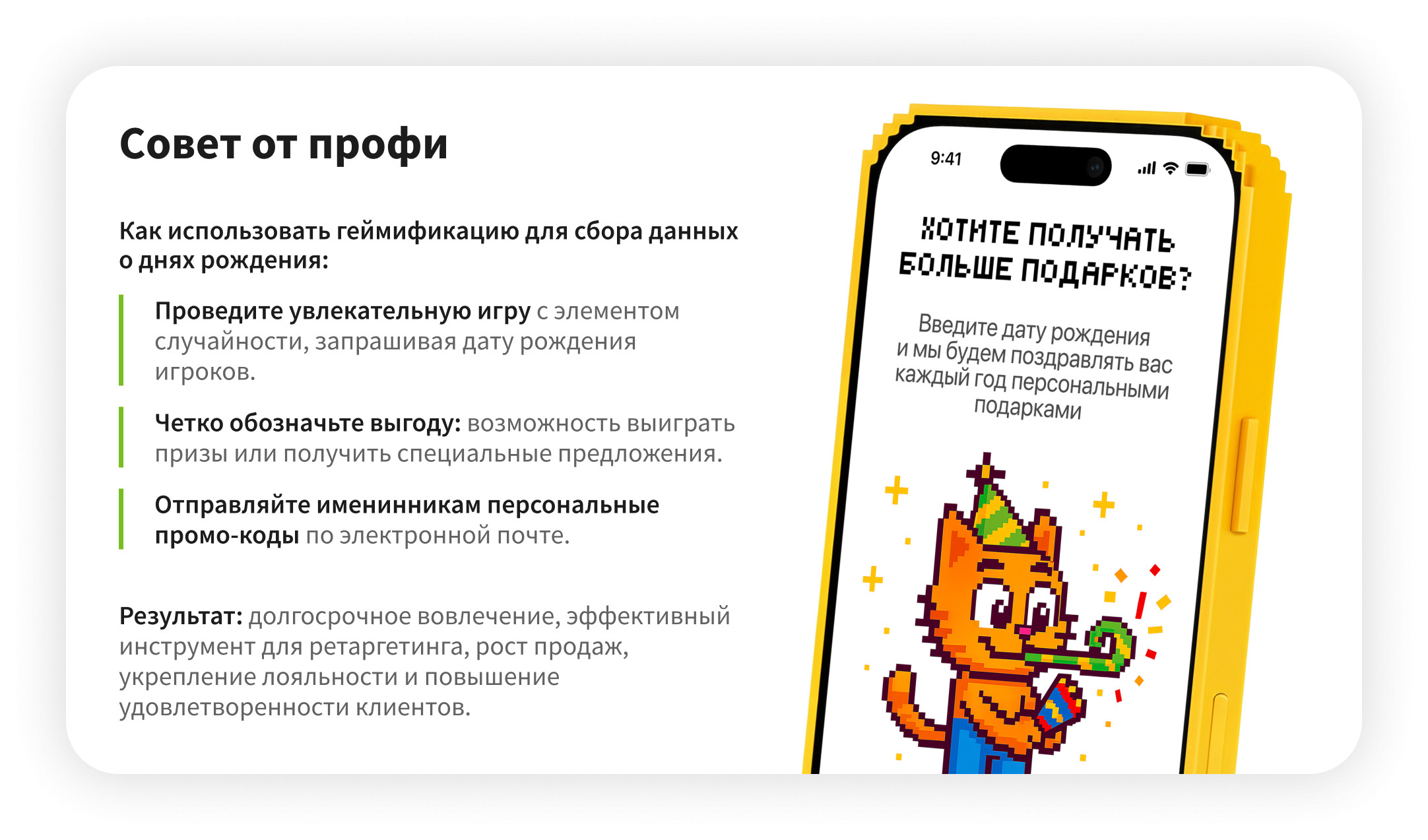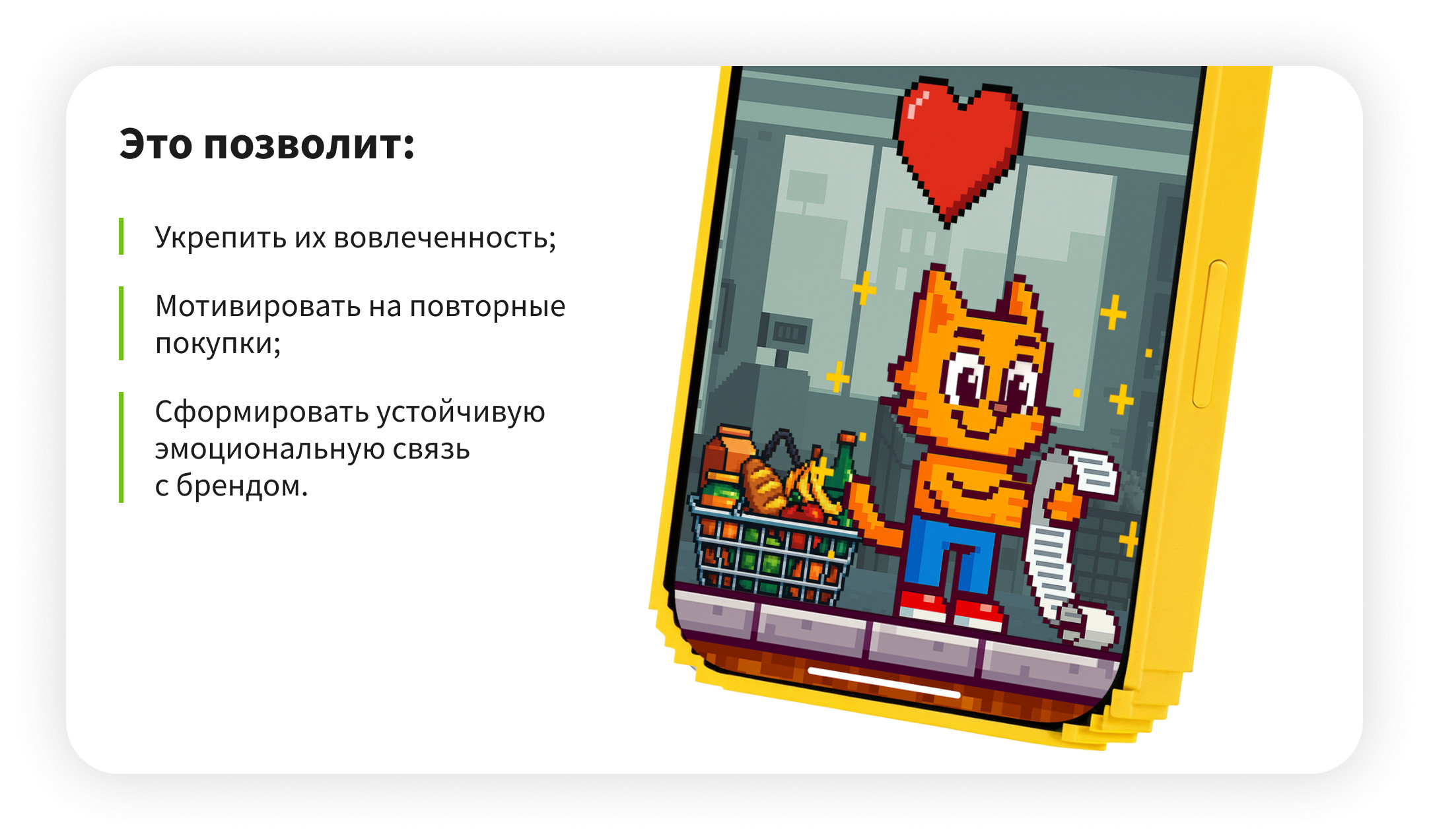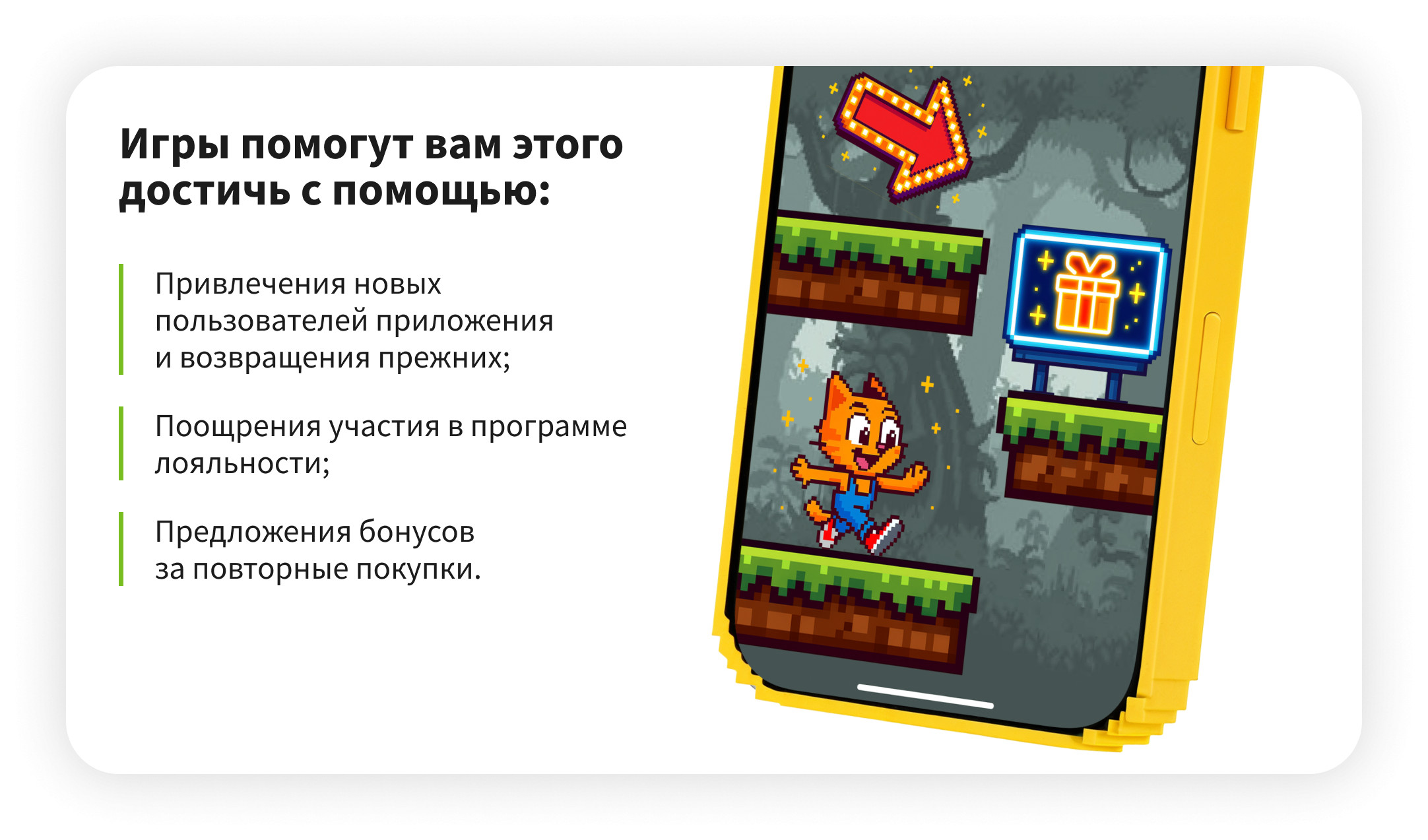 Геймификация также побуждает клиентов к активному взаимодействию с брендом. Статическая платная реклама в социальных сетях может быть невероятно привлекательной, но она не побуждает к такому активному взаимодействию, как интерактивная игра. Современные потребители ждут от любимых брендов персонализированного подхода. Чтобы оправдать эти ожидания, компаниям необходимо собирать и анализировать данные о клиентах. Например, игровой тест на определение типа личности или потребительского профиля помогает в легком формате собрать ключевую информацию о предпочтениях, привычках и важных датах. Полученные инсайты становятся основой для выстраивания индивидуальной коммуникации, специальных предложений и сервиса, который не просто нравится, а вызывает лояльность и эмоциональную связь с брендом. Превратить покупателя в настоящего поклонника бренда — цель любой долгосрочной стратегии. Но настоящая лояльность не дается просто так, ее нужно завоевать. Эффективный способ добиться этого — внедрение игровых механик. Они помогают привлекать аудиторию в приложение, вовлекать в программу лояльности и поощрять повторные покупки. Ожидание нового вознаграждения и удовольствие от процесса превращают обычные покупки в увлекательную привычку, побуждая покупателей выбирать вас вновь.