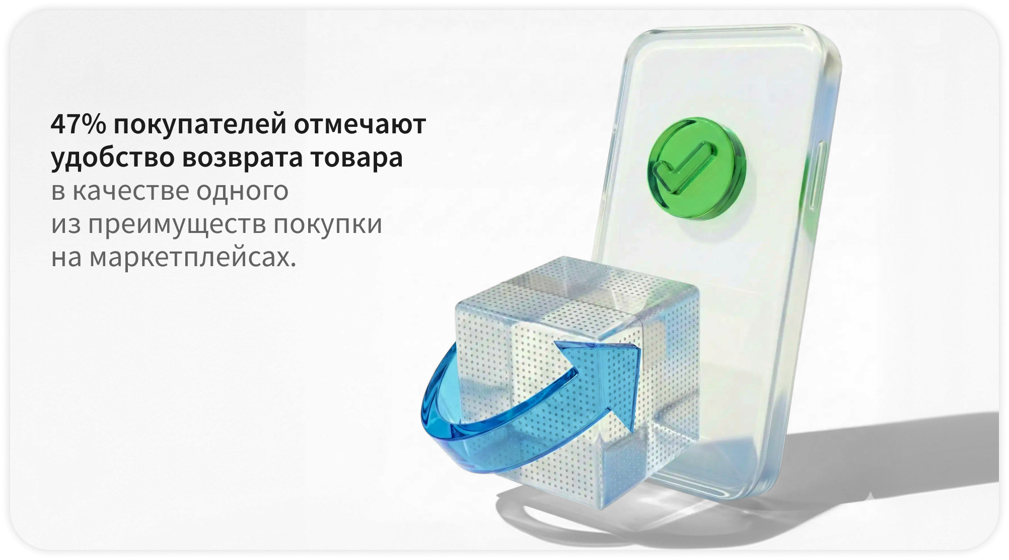 Большинство российских покупателей (74%) являются участниками программ лояльности магазинов. Причиной подключения этих программ являются не только скидки, но и выгода от покупок в более широком смысле (Диаграмма 4). Рекомендации: Самыми понятными остаются условия маркетинговых акций и программы лояльности, которые можно описать одним предложением: — за любой заказ кэшбэк 2%, — каждый 7-й кофе в подарок, — скидка 5% при покупке от 10 000 рублей и т.п. Простота и прозрачность мотивирует покупателей возвращаться. Покупатели будут признательны за уважение к их времени и отсутствие скрытых условий. Действительно, возможность отказаться от заказанного продукта прямо в пункте выдачи устраняет одно из главных опасений при онлайн-покупках «вдруг товар не подойдет, не понравится в реальной жизни или просто передумаю покупать?». Рекомендации: Процесс поддержки должен быть организован эффективно и удобно для пользователей. Не заставляйте своих клиентов прорываться в чате через ответы ботов, которые часто неправильно интерпретируют вопрос, отсылают к разделу FAQ и тратят время посетителя сайта или приложения впустую. Конкурировать с маркетплейсами можно только в том случае, если клиент будет на всех этапах взаимодействия с вашим интернет-магазином чувствовать комфорт и заботу. Рекомендации: В следующей части мы продолжим делиться полезными рекомендациями — обязательно читайте и внедряйте их в работу вашего онлайн-магазина для укрепления своих позиций на рынке.