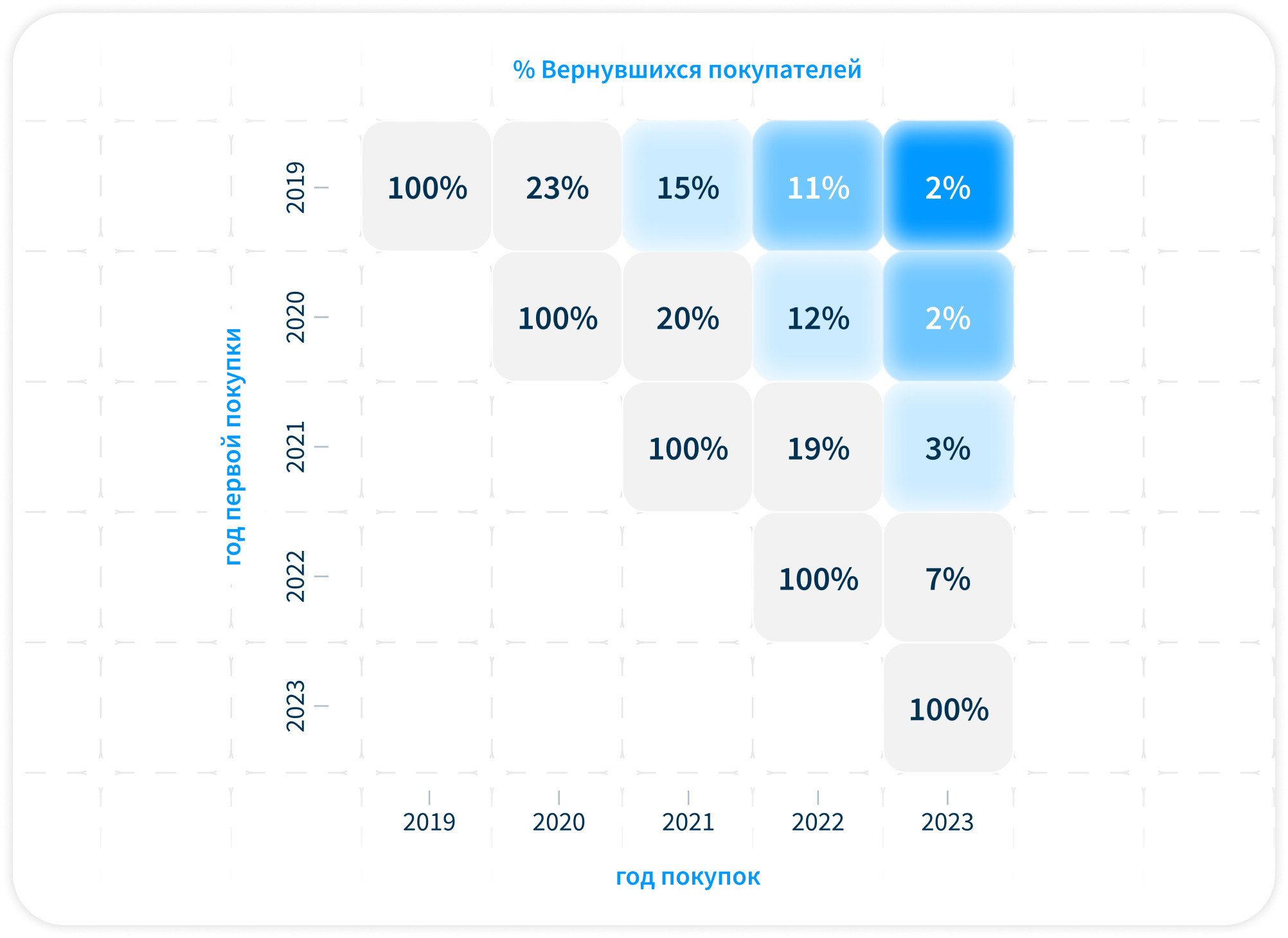- Снижение доли повторных покупок с 23% (2020) до 19% (2022).