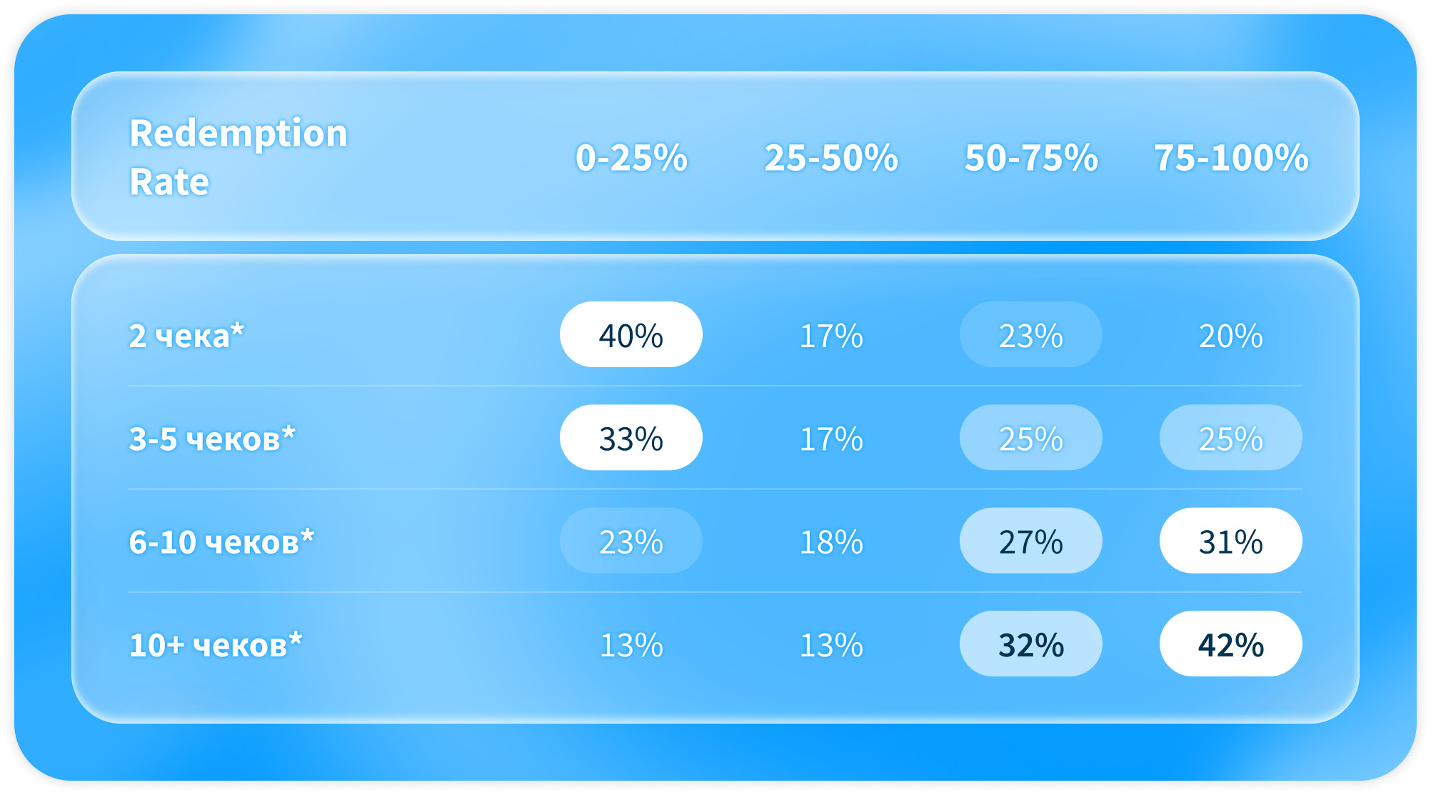 - Отсутствие мотивации к использованию баллов из-за их бессрочности. Для примера, покупатели, у которых было всего 2 чека за год, в 40% случаев почти не использовали накопленные баллы.
