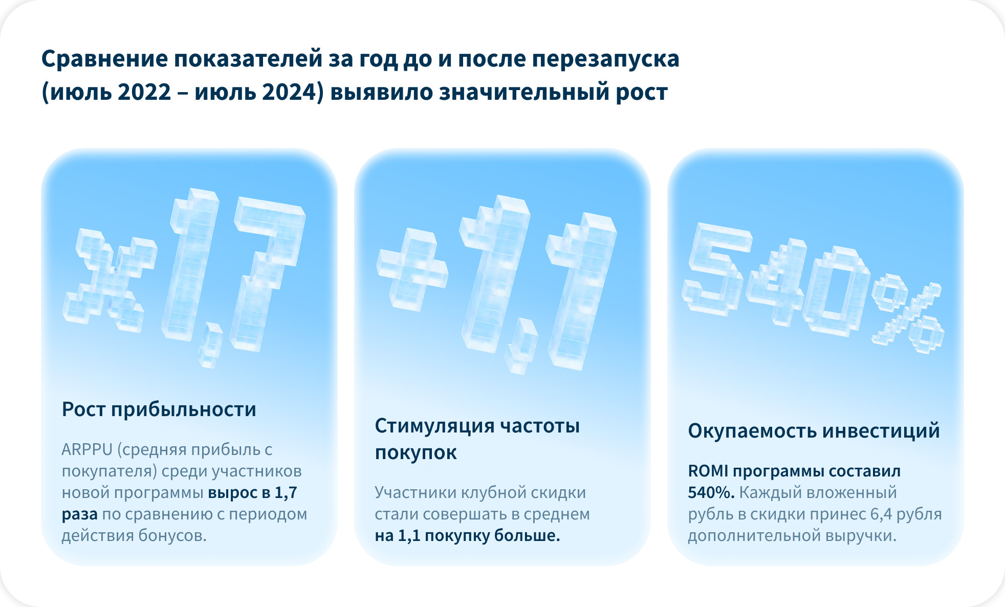 Особое внимание было уделено клиентам, которые уже были участниками предыдущей программы. Для них предусмотрели возможность использовать накопленные баллы до истечения срока их действия. После перехода на новую систему лояльности эта аудитория получила специальное ограниченное предложение с повышенной скидкой, что позволило сохранить вовлечённость и плавно интегрировать её в обновлённые условия. Анализ эффективности перехода с бонусной системы на целевую клубную скидку показал впечатляющие результаты. Несмотря на осознанное сокращение количества участников новой программы в 5 раз из-за механики ручной активации и условий совместимости с промоакциями, обновленный подход доказал свою исключительную рентабельность.