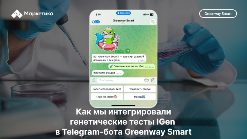 1. Регистрируется и заполняет анкету: ФИО, пол, возраст, рост, вес и другие характеристики. 2. Выбирает удобную дату и время доставки комплекта для сбора генетического материала в домашних условиях. 3. Получает бокс с инструкцией и сдаёт материал дома. 4. Назначает обратный визит курьера для передачи генетического материала. 5. Получает уведомление в боте о готовности результата, а сертификат с данными генетического теста приходит на электронную почту. Мы добавили систему отслеживания статусов, чтобы пользователь всегда понимал, на каком этапе находится процесс тестирования: от передачи курьеру до готовности результата. Как мы это реализовывали: Для реализации проекта мы использовали этот технологический стек: Фронт: HTML, CSS, JavaScript, Vue (админка)Бэк: PHP, Golang, Laravel (админка)Базы данных: Postgres, RedisОчереди: RabbitMQКонтроль версий: GitLabРазвёртывание: Docker Новый функционал бота Greenway Smart уже доступен 92 000 пользователям и позволяет: Мы получили обратную связь от заказчика: "Нам нужен был понятный и современный инструмент для внедрения нового продукта. В первую очередь мы хотели облегчить весь процесс для наших клиентов. И теперь клиент, не выходя из дома, получает всю информацию о своем здоровье"— Greenway Global Недавно был релиз бота в России, в дальнейшем планируется расширение на страны СНГ. Мы разрабатываем Telegram-ботов для решения задач любой сложности.Пишите на почту welcome@marketica.pro — обсудим ваш проект!