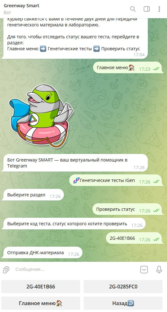 Раньше для сдачи генетического теста нужно было заказывать его на сайте, ждать курьера и заполнять бумажную анкету. Наш заказчик — международная компания Greenway Global — решила изменить это. Мы уже делали для них многофункционального Telegram-бота (читать кейс), а теперь поступил новый запрос и он был достаточно амбициозным: компания решила автоматизировать прохождение генетического тестирования для партнеров и клиентов Greenway по всей России — быстро, удобно и без бумажной волокиты.