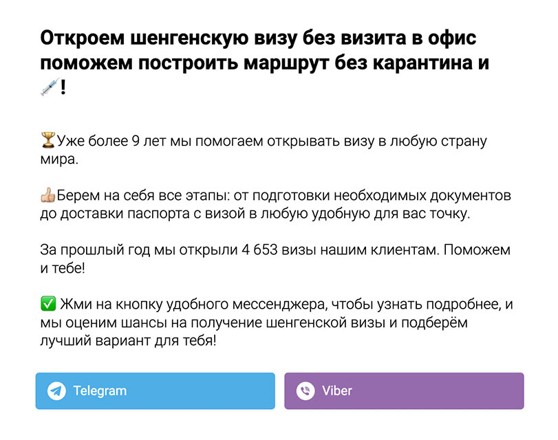 — полезная подборка, например: топ 5 стран для открытия шенген визы в 2025 году. Пример: — бесплатная консультация специалиста. Это можно подать по-разному: бесплатная оценка шансов на получение визы или бесплатный подбор визы от специалиста. Пример: 2. Сегментация аудитории. Это необязательный шаг, но внутри чат-бота вы можете сегментировать аудиторию по разным критериям. Например, можно спросить: — какие страны их интересуют;— были ли ранее визы в паспорте;— какая цель поездки;— и другие варианты. 3. Прогрев. Этот шаг является самым важным в автоворонке. В сообщениях автоворонки важно делиться с пользователем полезной информацией о вашей компании, показать кейсы, рассказать о лучших предложениях. Важно настроить так, чтобы пользователю приходило не больше 2-х сообщений в день. И не делайте слишком длинную цепочку, оптимальный вариант — до 5 дней. 4. Оставление заявки. Этот пункт мы выделяем отдельно, хотя он разрабатывается одновременно с прогревом. В каждом сообщении цепочки обязательно делайте призыв оставить заявку на консультацию. Можно настроить, чтобы пользователи могли оставить заявки прямо внутри боте, а можно вести их с бота на ваш сайт или специальный квиз. По нашему опыту брать заявку прямо в боте более эффективно, чем вести на сайт. Так пользователю не нужно выходить из мессенджера. 5. Рассылки. Этот шаг вступает тогда, когда у вас накопилось значительное количество подписчиков в чат-боте Телеграм. И логично делать полезные рассылки для тех, кто уже прошел всю цепочку сообщений. В рассылках можно рассказывать о специальных предложениях на туры или открытие виз, интересные подборки или новости компании. Такие рассылки желательно делать 1-2 раза в месяц. Рассылки — очень важный этап. После прохождения всей цепочки сообщений пользователи очень быстро забудут о вашей компании, если вы не будете о себе напоминать. С помощью рассылок мы увеличиваем количество заявок в наших проектах. Проект 1. Привлекли 5456 подписчиков в чат-бота и получили 1000+ заявок. Проект 2. Привлекли 2099 подписчиков в чат-бота и получили 184 заявки. Наша команда помогла внедрить чат-боты для более 80 разных компаний. Оставляйте заявку на нашем сайте, если хотите получить консультацию по созданию чат-ботов (автоворонок) для вашего бизнеса.