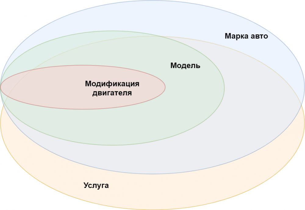 В пересечении желтой и синей областей услуга пересекается с маркой автомобиля, соответственно она появляется в шаблонах текста на странице, метатегов.