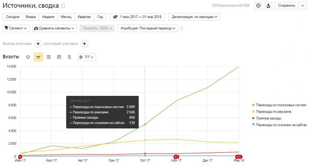 Таким образом, есть перспектива для будущего продвижения: больше 6000 страниц сейчас показываются на первой странице поисковой выдачи, при появлении их на позициях выше пятой (на первом экране) CTR становится в два раза выше. Заказчик получил стабильный поток целевых посетителей на сайт по цене существенно ниже конкурентов: