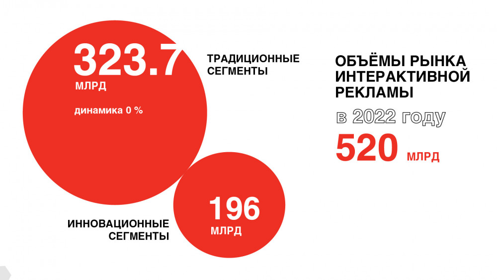 По итогам 2022 года традиционные сегменты продемонстрировали нулевую динамику — объем затрат остался на отметке в 323,7 млрд руб. А вложения в инновационные сегменты по оценке АРИР составили 196 млрд руб. С 2022 года Ассоциация начинает считать рекламные инвестиции по обновленной методологии. Она заключается в разделении рынка на так называемые традиционные и инновационные сегменты. Это решение продиктовано масштабным изменением ландшафта российской digital-отрасли.
