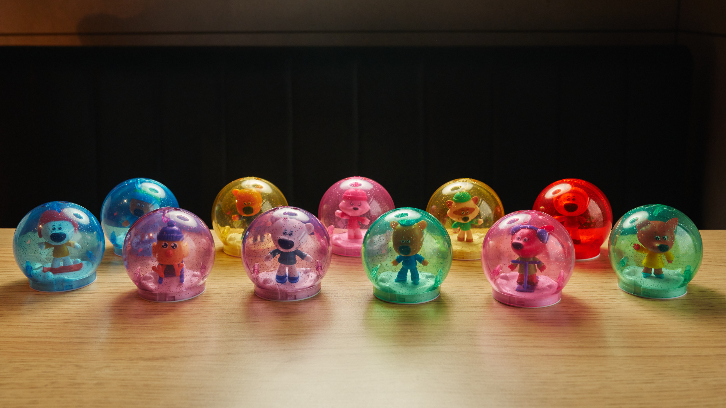 В коллекцию вошло 11 уникальных фигурок с персонажами мультсериала: медвежатами Тучкой и Кешей, енотиками Саней и Соней, а также с Лисичкой и Цыпой. Каждая фигурка представляет собой героев в зимних образах: они катаются на коньках, лыжах и сноуборде. В комплекте с игрушками идут прозрачные шарики: фигурку можно поместить внутрь и повесить на новогоднюю елку.