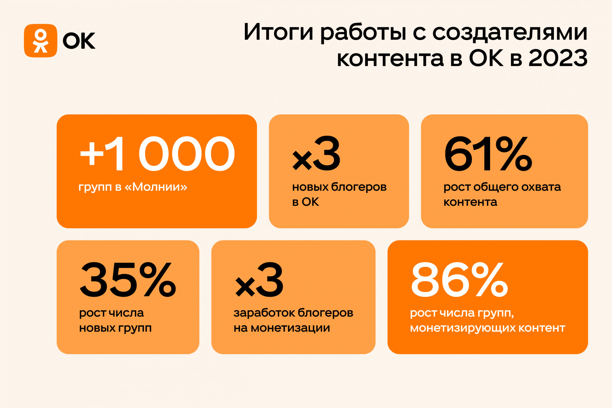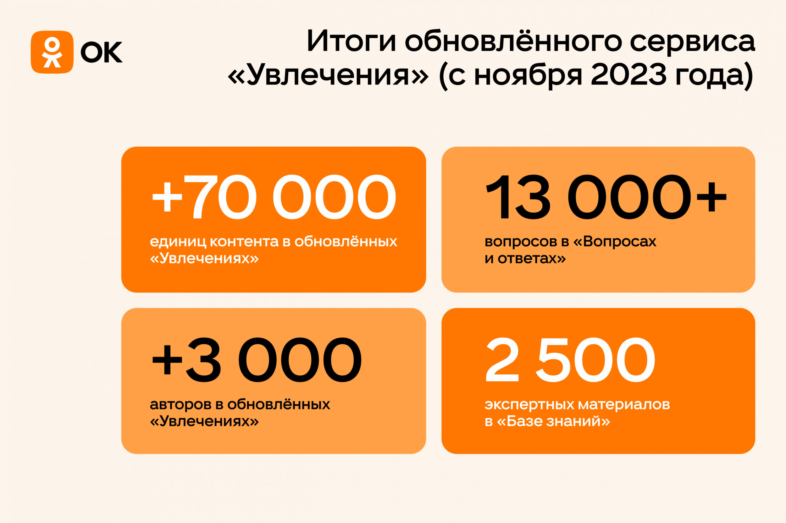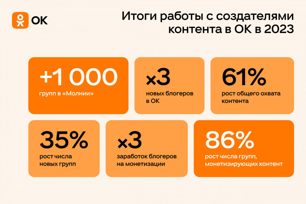 ОК продолжает фокусироваться на уникальном контенте, поэтому привлекает на платформу новых авторов. В первую очередь это те авторы, которые пишут про увлечения, то есть отвечают позиционированию ОК. За год на платформе появились сотни новых активных блогеров, их общее число в 2023 года увеличилось в 3 раза. Самые растущие блогеры (по динамике роста количества подписчиков за год) в 2023 году — Вкус Жуковы (+200 тысяч подписчиков), Голландец в России (+146 тысяч подписчиков), Екатерина. Честный кондитер (+133 тысячи подписчиков). В поддержку начинающих создателей качественного контента в ОК работает алгоритм «Молния». Он помогает увеличить охват публикаций и получить первых подписчиков тем блогерам и медиа, которые регулярно публикуют уникальный и интересный контент. За последние 12 месяцев более 1000 групп получили поддержку «Молнии». В конце октября 2023 года Одноклассники обновили «Увлечения», теперь это полноформатный сервис с профессиональным и пользовательским контентом. За два месяца работы в сервисе было опубликовано свыше 70 тысяч единиц контента, более 3 тысяч авторов и 25 тысяч пользователей регулярно публикуют в «Увлечениях» свой контент. Наиболее популярными тематиками для постинга стали рукоделие, кулинария, отдых и туризм, питомцы и садоводство. «Базу знаний» пополняют эксперты, к её наполнению уже привлекли более 300 известных блогеров рунета, которые обладают экспертизой по конкретному направлению увлечений. За первые два месяца работы в разделе было опубликовано более 2500 экспертных материалов. Раздел «Вопросы и ответы» за этот период собрал свыше 13 тысяч вопросов от пользователей, на которые отвечают как эксперты, так и пользователи.