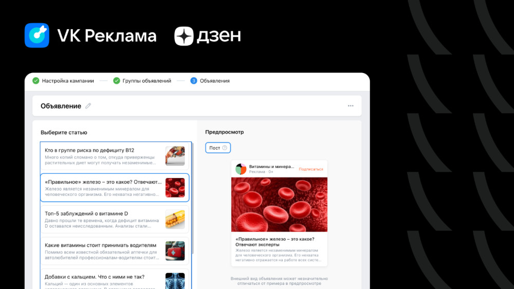 В рекламном кабинете можно установить бюджет и настроить таргетинг, учитывая демографические, географические параметры и интересы целевой аудитории. Алгоритмы VK Рекламы повышают эффективность кампаний, анализируя обезличенные данные пользователей и содержание канала, показывая объявления тем, кто с наибольшей вероятностью заинтересуется статьёй или каналом. Пользователи увидят объявления в мобильной и десктопной версиях контентной платформы, а также в Дзен Новостях.