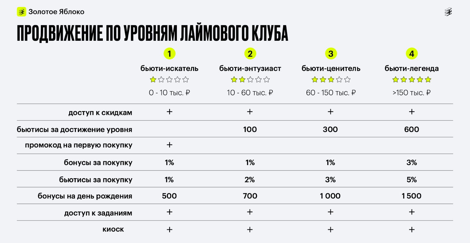 1. Бьюти-искатель — стартовый уровень членства в Лаймовом клубе. На этом этапе за покупки начисляется 1% бонусами и 1% бьютисами, а еще 500 бонусов в подарок на день рождения.