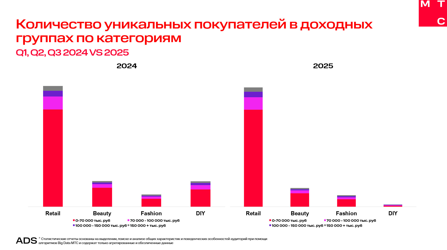 В среднем 13% beauty-покупателей зарабатывают свыше 100 тыс., и только 4% — свыше 150 тыс. руб. ежемесячно. Тренд на превращение крупных игроков рынка в универсальные площадки для всех аудиторий позволяет эффективно работать как с массовым, так и с премиальным потребителем в рамках одной витрины,