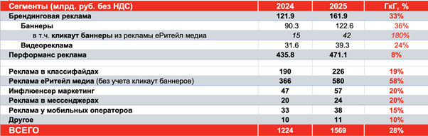 Объем сегмента брендинговой рекламы в 2025 году составил 161,9 млрд руб., что на 33% выше показателей предыдущего года. Баннеры достигли объема в 122,6 млрд руб., увеличившись на 36%. При этом кликаут баннеры из рекламы еРитейл медиа, которые учитываются внутри баннеров, выросли с 15 до 42 млрд руб., то есть на 180%. Видеореклама выросла на 24% и достигла объема в 39,3 млрд руб.