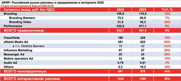 Перформанс реклама остается одним из крупнейших сегментов по объему — 471,1 млрд руб., однако темпы роста здесь скромнее — всего 8%. Объем рекламы в классифайдах вырос на 19% — до 226 млрд руб. При этом крупнейшим сегментом по объему в 2025 году стала реклама еРитейл медиа (без учета кликаут баннеров), достигшая показателя в 580 млрд руб., также это самый быстрорастущий крупный сегмент (+58% год к году).