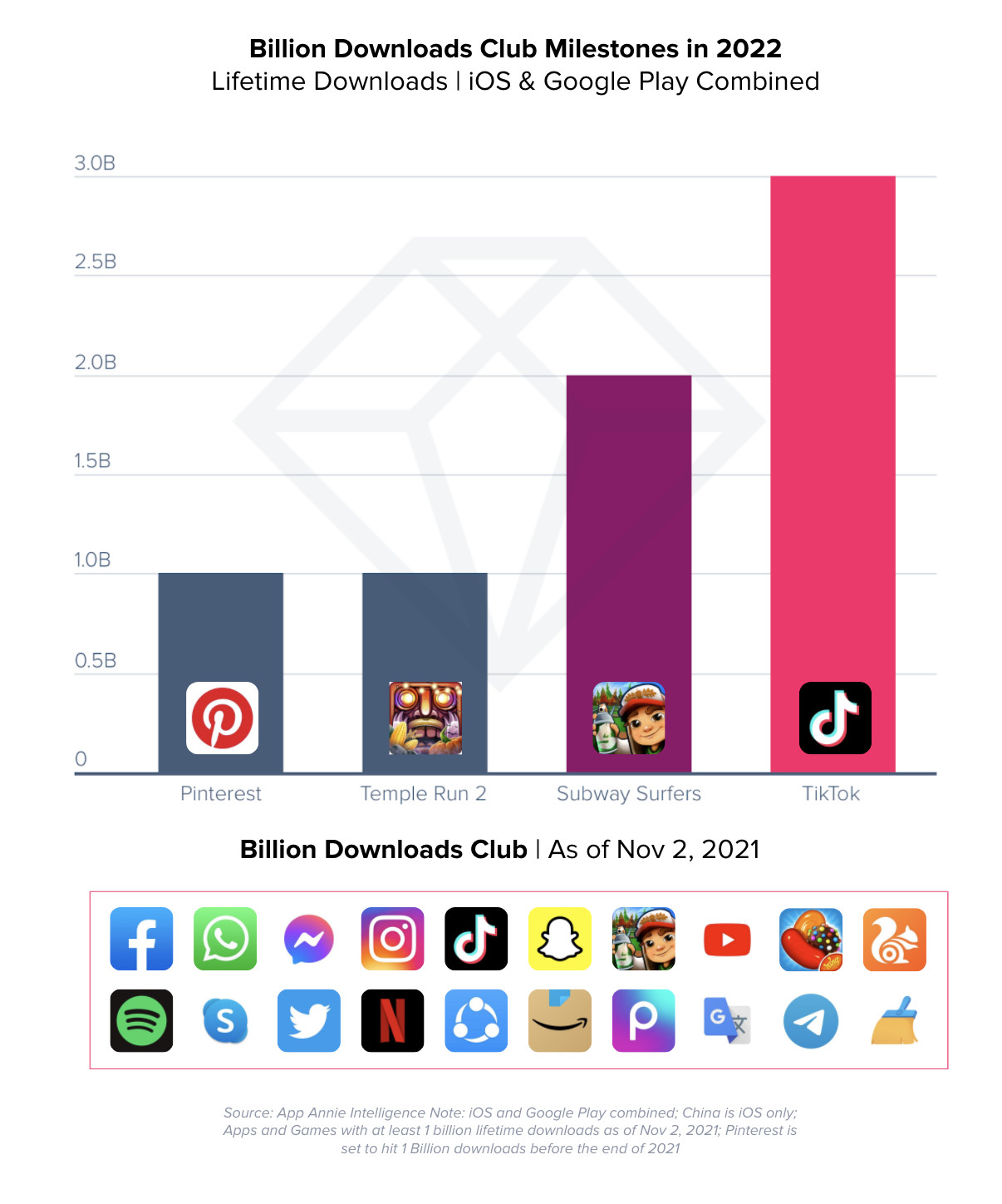 - Pinterest и Temple Run 2 достигнут 1 млрд загрузок; Subway Surfers подходит к черте в 2 млрд загрузок; TikTok скоро достигнет 3 млрд загрузок и $3 млрд по расходам пользователей.