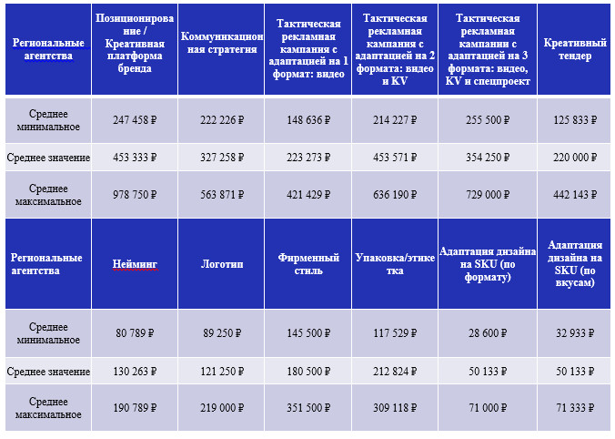 По данным исследования, минимальная стоимость нейминга в регионах начинается от 80 тыс рублей, от 89 тысяч — создание логотипа. Самой дорогостоящей услугой региональных агентств стала разработка тактической рекламной кампании с адаптацией на 2 формата, ee средняя цена составила 453,5 тыс рублей, на втором месте позиционирование. Средняя стоимость разработки позиционирования и креативной платформы бренда — 453 тыс рублей, при этом минимальная цена отличается от максимальной почти в 4 раза — 247 тыс рублей и 979 тыс рублей соответственно.