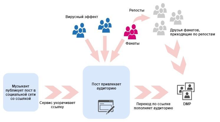 В базу DMP заходит также лишь одноименный сервис. При этом из базы отдаются только агрегаты данных об аудитории, но не сами данные. Эти агрегаты ложатся в основу аналитики, которую получают в личном кабинете пользователи сервиса из музыкальной индустрии.