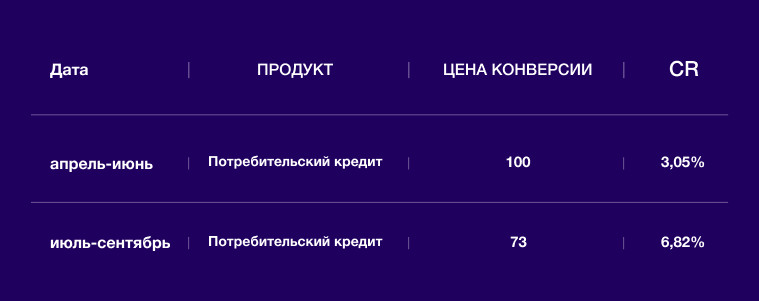 Объявления выглядят как кликабельные карточки с фотографией товара и информацией о нем. Выбраны массовые продукты B2C сегмента — дебетовая карта и потребительский кредит. Возрастной таргетинг — от 18 до 55 лет, так как этот возраст указан в условиях продуктов. В рекламных кампаниях выбрали в качестве места показа Поиск, РСЯ и товарную галерею. Выбрали автоматическую стратегию «Максимум конверсий», оптимизированную под цель «Отправка заявки» на релевантные продукту посадочные страницы. В новых рекламных кампаниях для старта выбрали небольшую сумму для теста товарных объявлений. По итогам первого месяца работы получили такие результаты по CR (таблица 1). В стартовый месяц бюджет по дебетовым картам в основном (84%) ушел на РСЯ, а по потребительским кредитам — на Поиск (около 67%). По эффективности стоимость конверсии по дебетовым картам была немного выше среднего, в сравнении с другими кампаниям, а по кредитам — оказалась самой низкой. По итогам первого месяца: Далее сравнили работу кампаний за два равных по бюджету периода: первые три месяца и последующие три. Результаты — в таблицах ниже. Для наглядности приняли стоимость конверсии за первые три месяца за 100%, а показатели за следующие месяцы выразили относительно нее. Это позволяет объективно оценить динамику. По дебетовой карте (таблица 2) получили такие данные: цену конверсий снизили на 44%, CR вырос с 1,22% до 7,10%. Число конверсии увеличилось на 69% при сопоставимом бюджете. Из таблицы 3 видно: по потребительскому кредиту тоже получили позитивные результаты. Цена конверсий снизилась на 27%, CR вырос с 3,05% до 6,82%.На 30% увеличилось количество конверсий.Товарные объявления показали лучшую конверсию (CR) в Поиске по сравнению с классическими поисковыми РК и Мастером кампаний. По ключевому показателю — стоимости конверсии — этот формат также оказался наиболее эффективным. В РСЯ сравнение возможно только с Мастером кампаний, поскольку классические РК в сетях для этих продуктов не запускались (на тот момент). В РСЯ показатели оказались слабее: конверсионность ниже, а стоимость конверсии — выше.Запуски для банка Хлынов прошли позитивно, но у формата бывают и менее успешные сценарии. Наиболее предсказуемо он работает для массовых продуктов с высоким спросом. Чем популярнее продукт, тем: