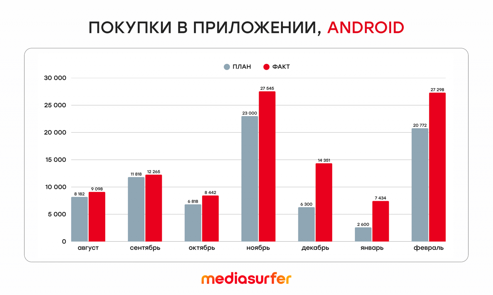 Например, в ноябре (Черная пятница) показатель ROAS составил 3 068%, а в декабре (новогодние продажи) — 2 592%. Это подтверждает устойчивость выбранной стратегии в условиях повышенного спроса и высокой конкуренции. Гибкая стратегия ретаргетинга и эффективное управление бюджетами позволили успешно решить две ключевые задачи кампании: Возврат пользователей в приложение: Рост количества покупок среди возвращённых пользователей: Android: Кампания стабильно превышала плановые показатели на протяжении всего периода. Всего пользователи совершили 106 433 покупки, среднее выполнение плана составило 134%. iOS: После первоначального отставания благодаря проведённым оптимизациям показатели значительно улучшились. Возвращенные пользователи совершили 37 899 покупок, среднее выполнение плана за период составило 130%. Этот кейс демонстрирует, что грамотное управление in-app ретаргетингом через технологичные решения и мультиканальный подход позволяет не только вернуть пользователей, но и увеличить продажи без роста CPA, даже в пиковые сезоны.