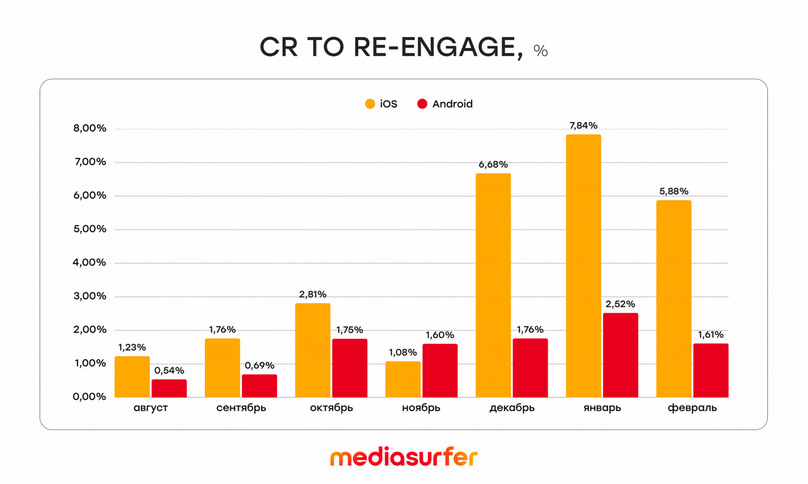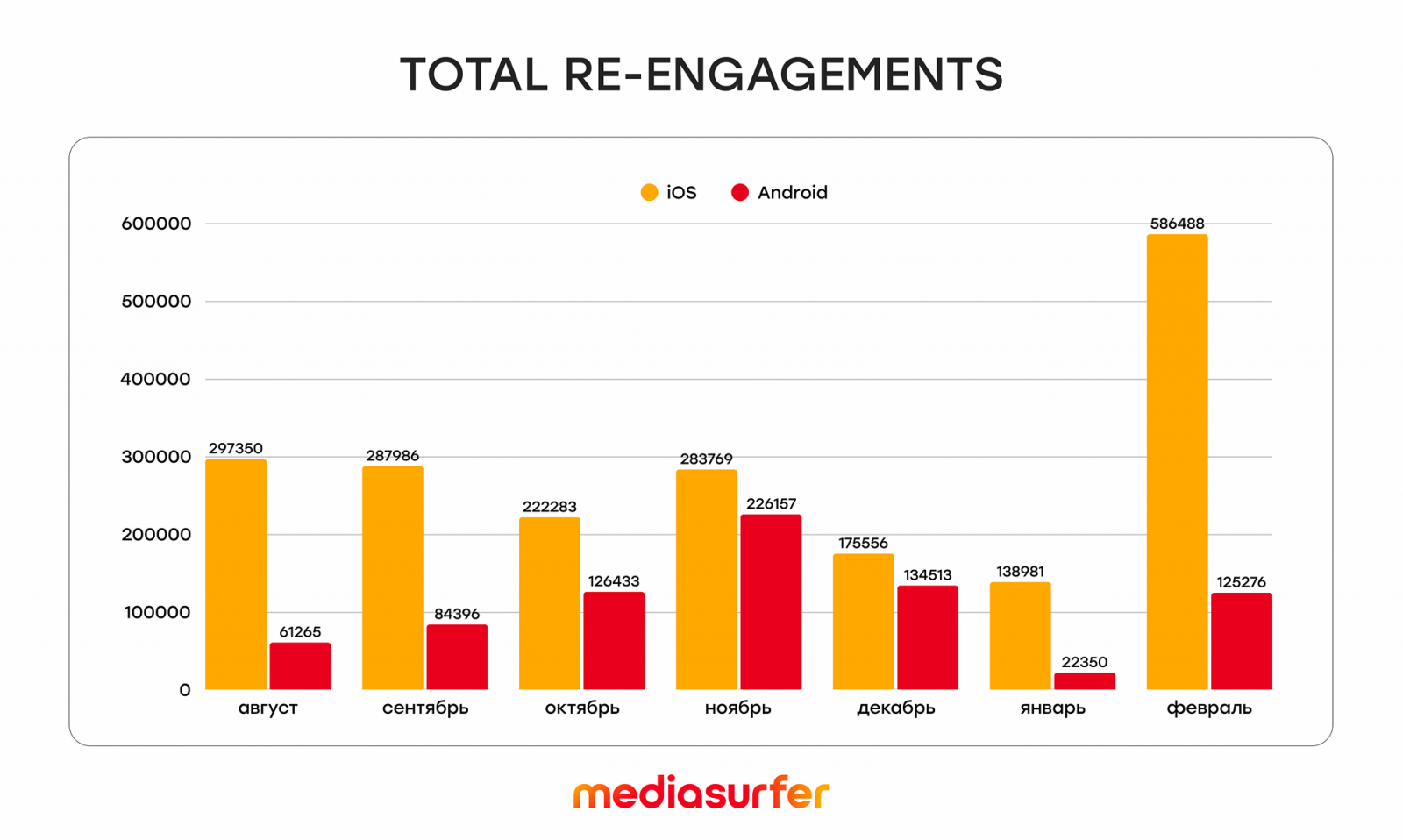 - Конверсия в повторные взаимодействия составила 1,23% на iOS и 0,54% на Android.