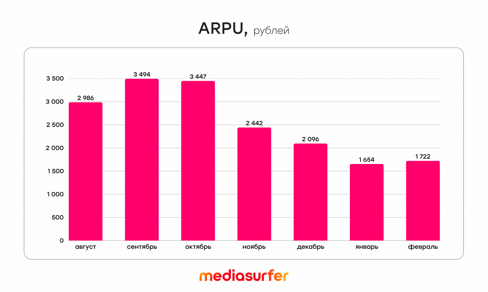 - Средний доход на пользователя (ARPU) достиг 2 986 рублей.