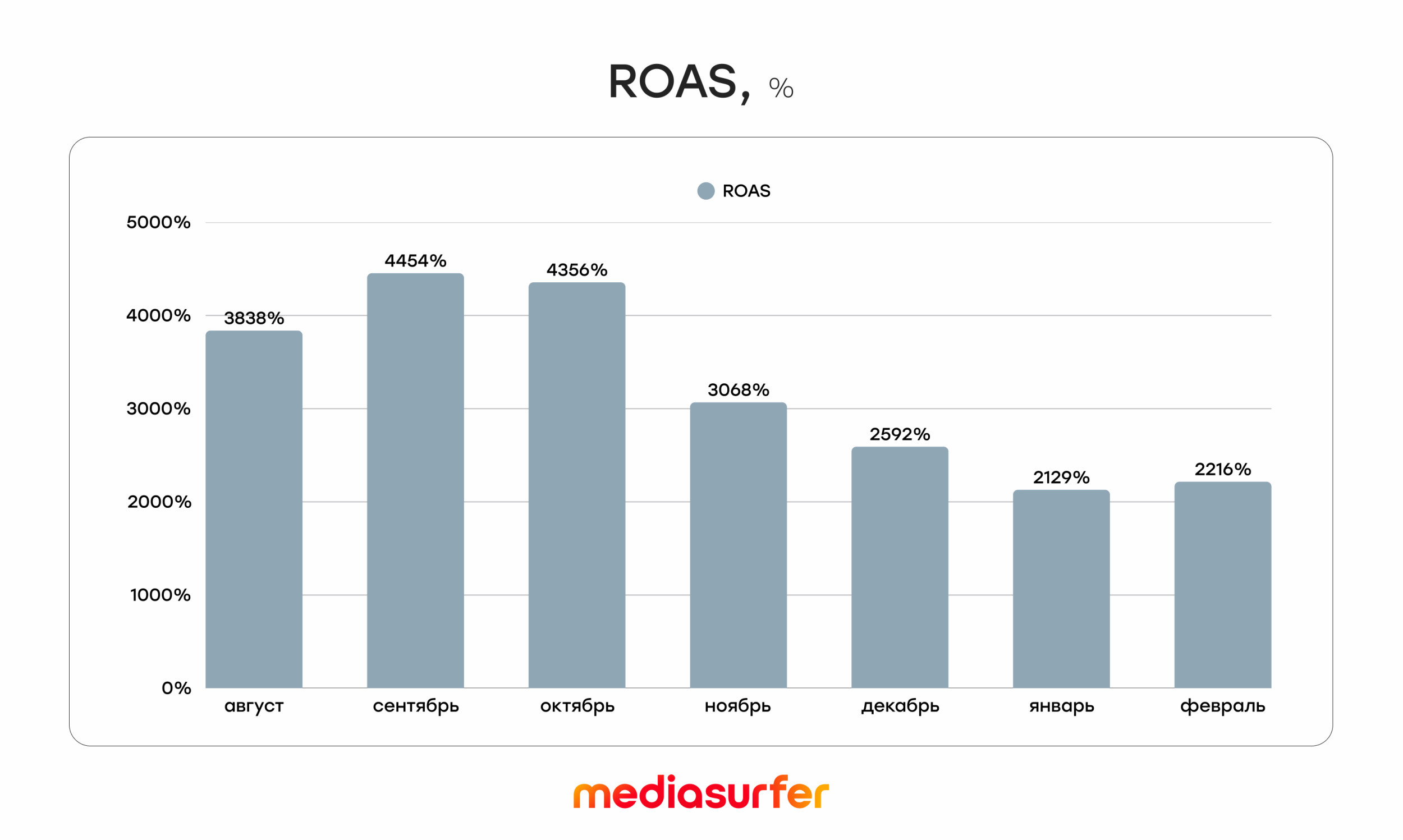 - Рентабельность рекламных вложений (ROAS) превысила 3 800%.