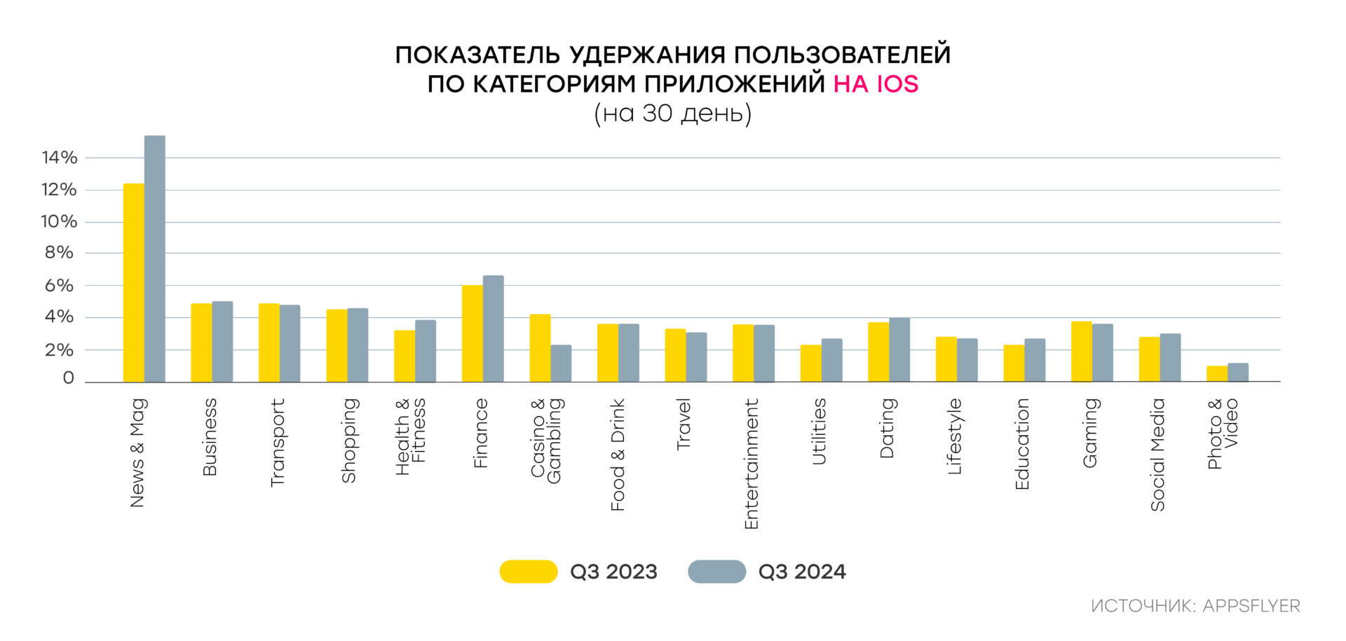 Такой сдвиг может быть связан со снижением показателей удержания. По данным Appsflyer, в период с 2021 по 2024 год Retention Rate на Android и iOS последовательно снижался.