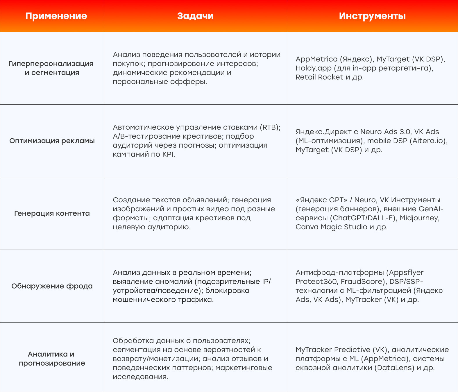 Рекламодатели всё чаще интересуются платформами вроде Holdy.app — в условиях борьбы за удержание ретаргетинг становится не опцией, а необходимостью. Он позволяет вновь активировать уже привлечённых пользователей, которые знакомы с продуктом, и доводить их до целевых действий. Эффективные стратегии ретаргетинга выстраиваются с учётом поведенческих сегментов, таких как: А важнейшими метриками в мобильном маркетинге становятся Retention Rate, LTV, ARPU (средняя выручка на пользователя) и DAU/MAU . Таким образом, рынок окончательно переходит от простого подсчёта установок к комплексной стратегии, в которой качество аудитории и её удержание становятся ключевыми составляющими эффективности рекламных инвестиций. Если раньше ИИ использовали в основном для генерации контента «для забавы», то сегодня он всё активнее внедряется в реальные бизнес-процессы. Его применяют на разных уровнях — от гиперперсонализации креативов до прогнозирования эффективности кампаний ещё до их запуска. На фоне ограничений в работе с данными — исчезновения IDFA, отказа от сторонних cookies и сложностей с использованием first-party данных — ИИ становится всё более востребованным инструментом для маркетологов. Вместо прямой идентификации пользователя алгоритмы анализируют поведение: отслеживают цепочки взаимодействий и на этой основе прогнозируют вероятность конверсии. Мы также собрали ключевые направления, где ИИ уже активно используется на рынке — или будет внедряться в ближайшее время. Самыми распространенными видами фрода все еще остаются: click injection (инъекция кликов с миллисекундной задержкой на Android), click flooding (массовая генерация случайных кликов) и SDK spoofing (эмуляция событий без установки SDK). Особую сложность представляют пост-атрибуционные манипуляции, когда эмуляторы или боты генерируют in-app-события (регистрации, покупки), имитируя реальную вовлечённость. Это приводит к искажению метрик, особенно в ретаргетинговых кампаниях с оплатой за действия (CPA). Современные антифрод-системы используют многоуровневый поведенческий анализ. Ключевые метрики, по которым выявляются аномалии: Большинство систем дополнительно проводят валидацию postback-событий, проверяя, что действия пользователя в приложении логично коррелируют с жизненным циклом, а не возникают синтетически. Также учитываются географические параметры (например, массовая активность с IP-хабов или VPN-прокси). Эффективные антифроды сегодня используют ML-модели и ИИ. Алгоритмы обучаются на больших массивах исторических данных — как по реальным, так и по мошенническим установкам — и способны в реальном времени распознавать аномальное поведение. Такие решения всё чаще интегрируются в DSP-платформы (Яндекс, VK, Aitera.io и др.), где антифрод-модули с ML-фильтрами автоматически отсеивают подозрительный трафик. Это не только снижает уровень фрода, но и позволяет оптимизировать закупки: рекламодатели инвестируют бюджеты в проверенные источники с высокой прозрачностью и стабильной конверсией. Рост стоимости привлечения пользователей, ужесточение требований к качеству аудитории и усиление контроля со стороны рекламодателей заставили рынок переориентироваться на более надёжные и эффективные форматы размещения. В центре внимания — премиальный инвентарь: Эти решения обеспечивают более стабильные показатели вовлечённост