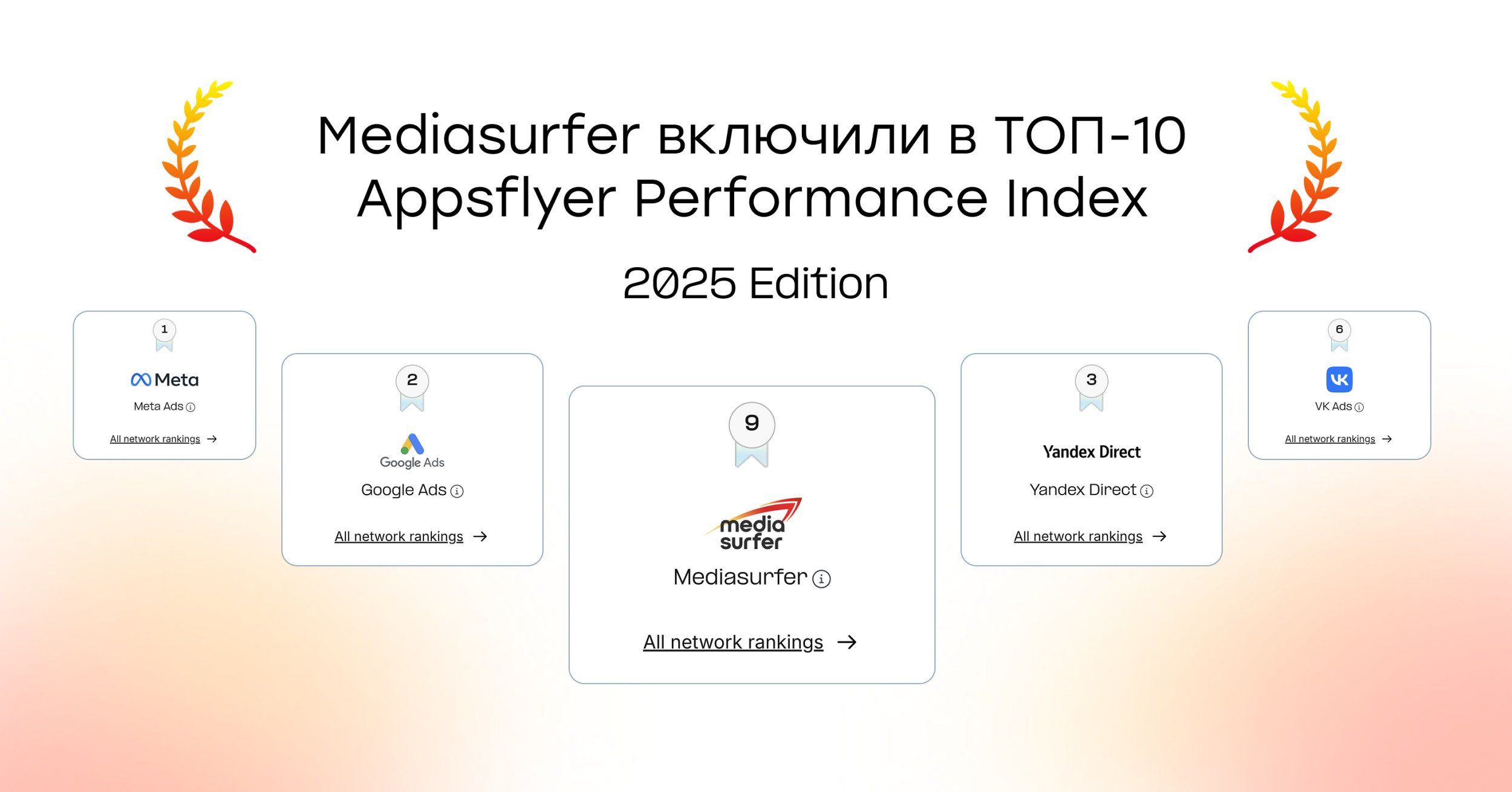 Вхождение Mediasurfer в ТОП-10 AppsFlyer Performance Index 2025 подтверждает экспертизу компании в области ремаркетинга и развитие собственных adtech-решений, способных конкурировать с крупнейшими международными медиа-источниками.