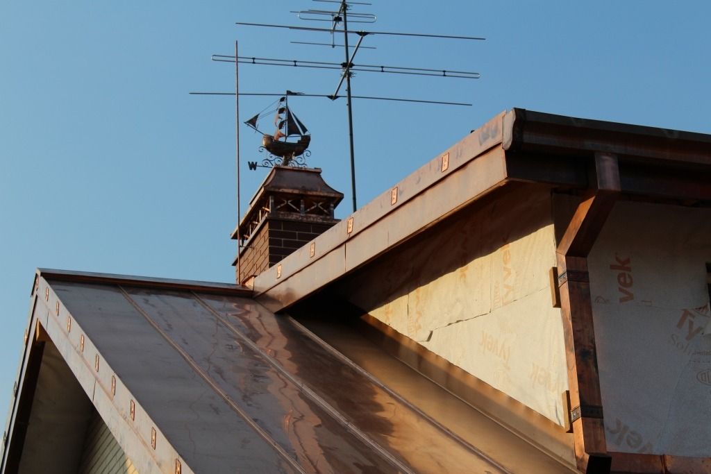 Всем привет! Меня зовут Денис Аксенов. Десять лет я работал простым кровельщиком, а так как медь является прекрасным материалом для изготовления крыш и водостоков, то я тщательно изучал технологии и особенности ее обработки. Постепенно я понял, что возможности меди безграничны, и начал экспериментировать. Первыми изделиями стали вот такие декоративные флюгеры на крыши и трубочисты на водостоках.