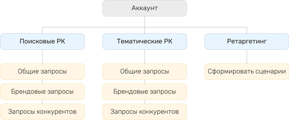 Продуманная структура заметно упрощает работу с рекламой: от подготовки большого количества вариантов объявлений, настроек таргетинга на пользователей, внесения корректировок по целям и бюджету до полной переработки.