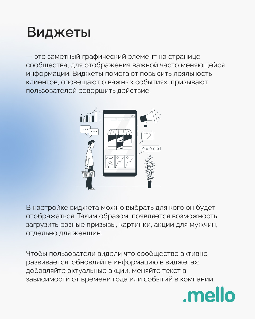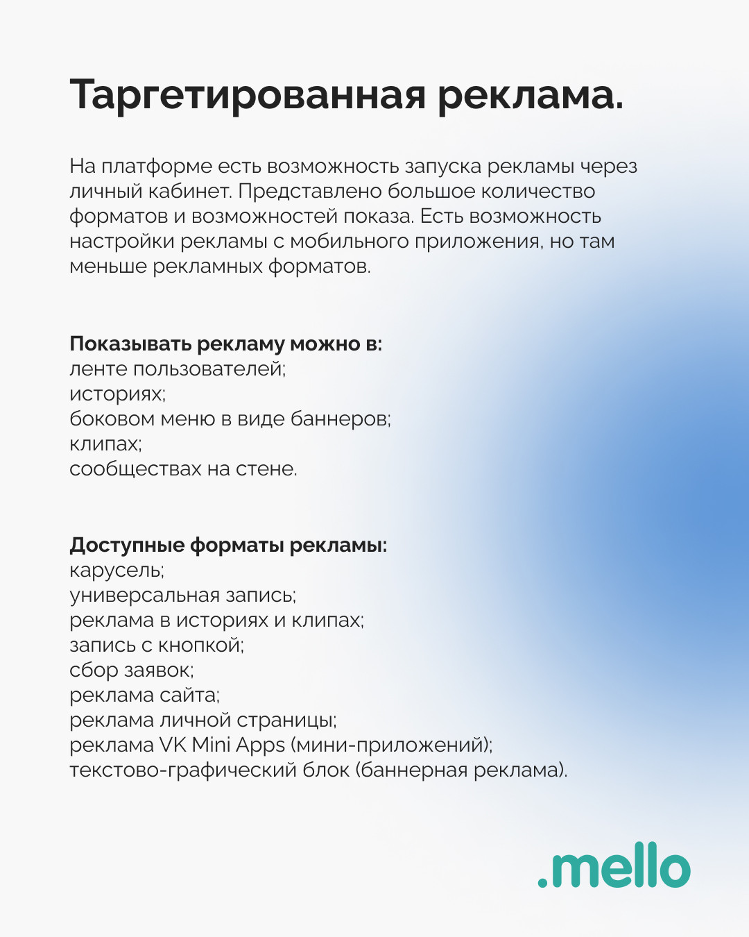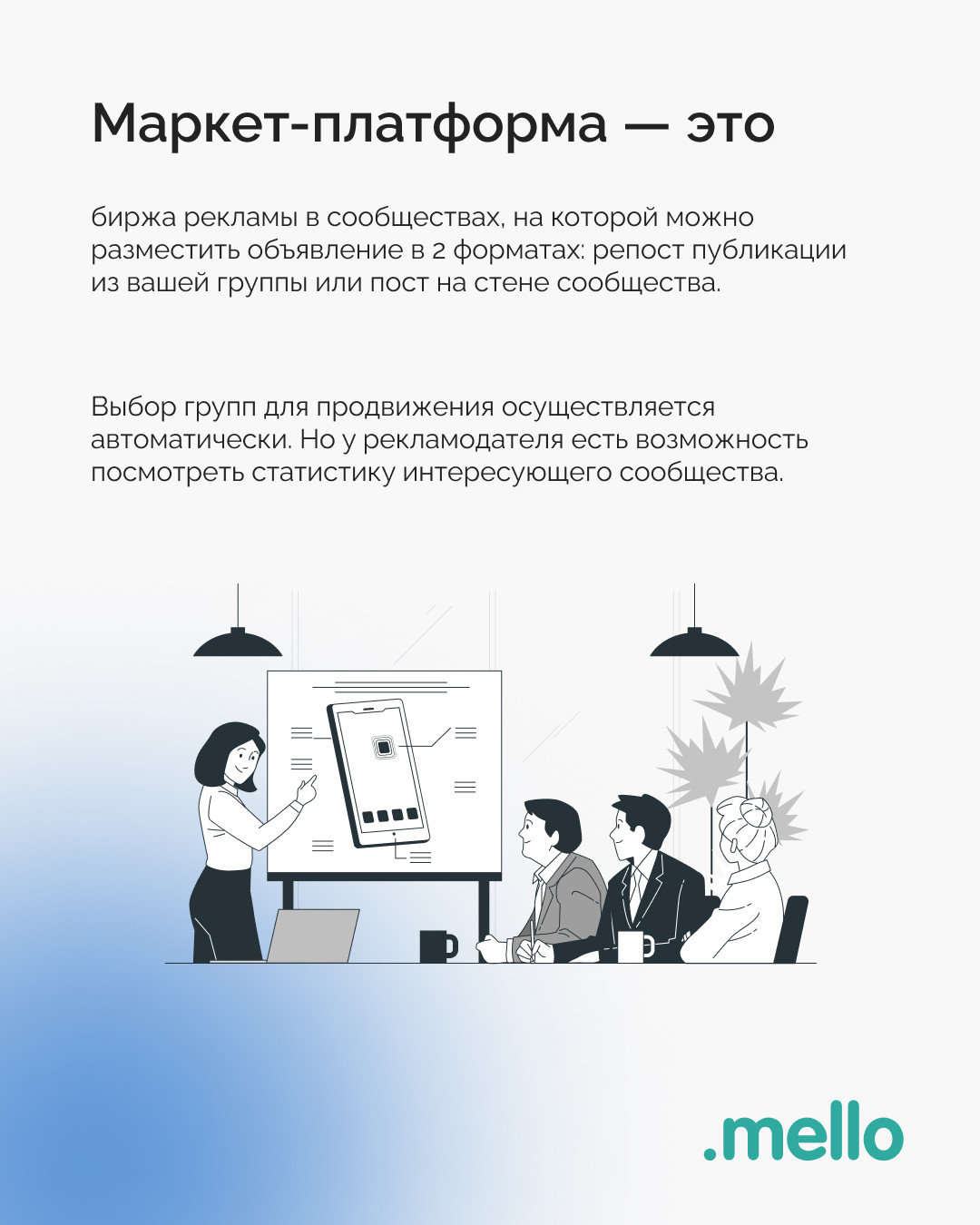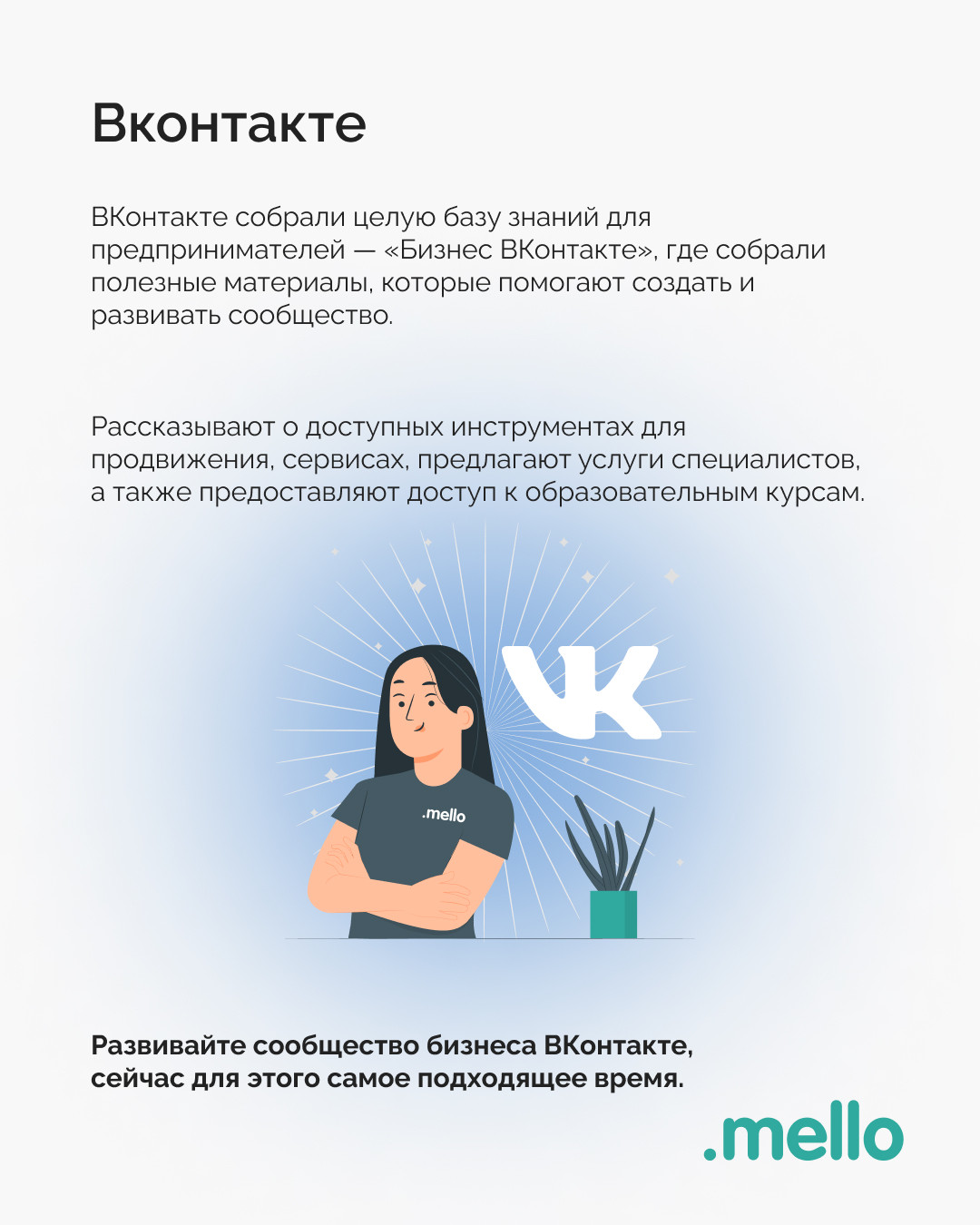 Здесь есть и инструменты рекламного продвижения, и возможность развивать сообщество органически. В карточках выделили основные возможности, которые предоставляет платформа для развития сообщества бизнеса. Указали как платные, так и бесплатные возможности продвижения.