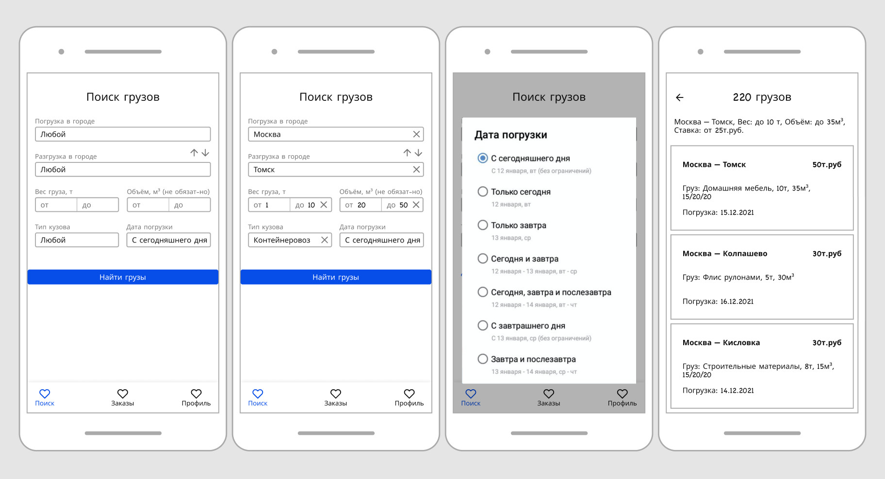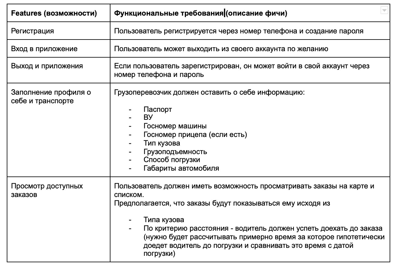 Не во всех проектах всё получается так просто. Например, у Димы в логистическом Uber ролей получилось в несколько раз больше — есть десять типов клиентов, которые могут отправить заказы, несколько видов водителей, которые должны видеть заказы, откликаться на них, дилеры, перевозчики и другие пользователи, каждый со своими функциями. Для каждой роли мы прописываем возможности — ещё их называют функциональными требованиями. Данные берём из бизнес-процессов, расписываем подробно. Выясняем у заказчика, что в проекте будет делать каждый пользователь, к каким функциям у него будет доступ, как система будет реагировать на его действия. Если хотите провести «Дискавери» сами, чаще задавайте себе два вопроса: «А что дальше?» и «Что, если нет?». Например, водитель в экспедиторском проекте может попасть в личный кабинет. А что дальше? Он увидит оповещение о новом заказе. А что дальше? Может предложить свою цену. А что дальше? Возьмёт заказ. А что, если нет, если откажется брать заказ? Сервис предложит новый? А если он возьмет заказ, но не поедет? И так далее. Итог этого шага — карточки с ролью и перечислением функциональных требований. Это внутренний этап «Дискавери», который делает аналитик без привлечения заказчика. Изучая получившиеся функциональные карточки, специалист делает список всех нужных функций проекта: регистрация, авторизация, поиск заказа, отклик на заказ. Получается большой список так называемых user stories, или разных возможностей, действий. К работе мы подключаем дизайнера, который в Figma создаёт прототипы — набор основных окон будущего приложения. Это не конечный дизайн, а примеры того, как будет работать проект. Цветовая палитра, расположение и порядок элементов в итоге могут отличаться. Смысл прототипирования — показать заказчику, как в целом будет работать проект, правильно ли в итоге мы поняли друг друга. И ещё это помогает глубже разобраться в функциях — заказчик по прототипам может уточнить, какие ещё в проекте есть нюансы. Результат прототипирования — это итоговое согласование проекта. Мы работаем итерациями: встретились с заказчиком, собрали данные, затем аналитики проработали их, снова встретились, обсудили результат и собрали уточнения, пошли на следующий круг. Количество итераций и дней на каждый этап зависит от масштабности проекта. Может быть, мы только сбор информации о бизнес-процессах проведем за несколько дней, если это крупный проект типа логистического Uber. Или соберём всю информацию буквально за 3-4 часа, если это условный маркетплейс с какими-то нетипичными требованиями. Результат фазы «Дискавери» у нас — техническое задание. Документ состоит из нескольких элементов: В других студиях в результате «Дискавери» заказчику могут передавать и другие документы. Например, MindMap с расписанными процессами. Анализ бизнес-процессов для наглядности мы тоже делаем в таком формате, но я не вижу смысла перегружать заказчика дополнительными сущностями — всё равно эта карта связей ему вряд ли понадобится, ведь все нужные данные есть в ТЗ. Вместе с ТЗ мы озвучиваем заказчику и коммерческое предложение — во сколько оцениваем проект, сколько по времени будем его делать, какие есть варианты, чтобы сэкономить или сделать проект быстрее. Быстрая аналитика с помощью «Дискавери» отлично подходит для разработки ТЗ, с ней удобно