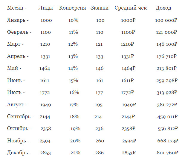 Пример таблицы, где каждый месяц показатели увеличены на 10%: