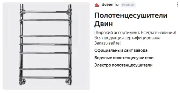 Компания Двин — российский производитель полотенцесушителей и сантехники. Полотенцесушители используются в каждой современной квартире для сушки вещей и регулировки температуры в ванных комнатах — просушивание помещения и исключение появления плесени. Средний чек на полотенцесушители Двин равнялся примерно 12 000р.