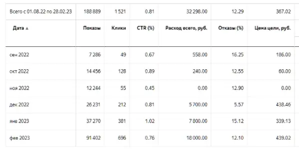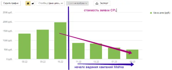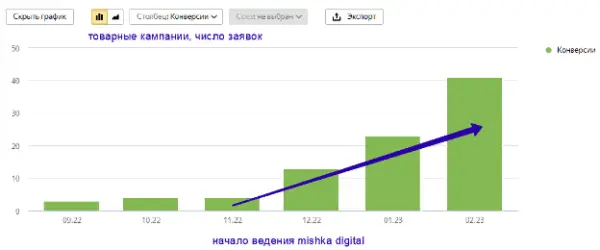 Мы провели мониторинг конкурентов, проанализировали их рекламные офферы и преимущества, на основе собранной информации скорректировали свой рекламный оффер и УТП. Рекламные кампании были настроены, задачей было провести аудит рекламы и провести оптимизацию, с целью снижения стоимости заявки и дальнейшего масштабирования и увеличения количества лидов. Первоначально в аккаунте были настроены практически все типы кампаний: поисковые, сетевые, товарные, динамические. Позже мы добавили Мастер Кампаний. Аудит рекламы показал, что существующие дневные лимиты кампаний на уровне аккаунта Яндекс Директа не дают полноценно работать кампаниям, вызывая их каждодневную остановку, что негативно сказывалось на их обучении. Поэтому одним из первых действий было увеличение суммы дневного бюджета до необходимого уровня дневного лимита по всем запущенным кампаниям. При этом недельный лимит по каждой из кампаний был рассчитан исходя из суммы 10-15 самой дорогой из целей оптимизации кампании (конверсии). В рекламном аккаунте использовался агентский аккаунт elama, с установленными дневными лимитами пополнения, они также не давали возможности полноценно откручиваться кампаниям, поэтому мы расширили сумму автопополнения и лимит остатка бюджета в Elama! Аудит рекламы показал, что Сетевые кампании РСЯ были практически не проработаны, тратили много бюджета, но практически не приносили заявки. Поэтому мы полностью пересобрали семантику и оптимизировали, отминусовали площадки и тп. Уже позже было принято решение их отключить совсем, так как другие типы кампаний работали, гораздо эффективнее, а трафик с сетей мы получали из других типов кампаний. По всем кампаниям провели анализ входящих запросов и заминусовали нерелевантные фразы, отключили неэффективные объявления, добавили новые фразы, оптимизировали корректировки по полу возрасту и типу устройств. Анализ статистики конверсий по времени суток в Яндекс Метрике показал наиболее эффективное время для получения конверсий. Рост числа заявок с товарных кампаниях в 10 раз с 4 в октябре, до 41 в феврале https://mishkadigital.ru/dveen?utm_source=vc&utm_medium=cpc&utm_campaign=smm&utm_term=poloten