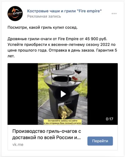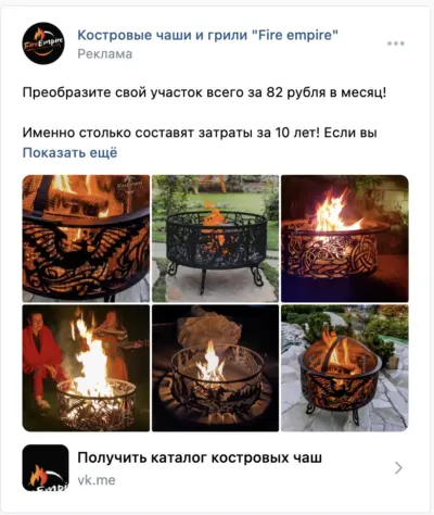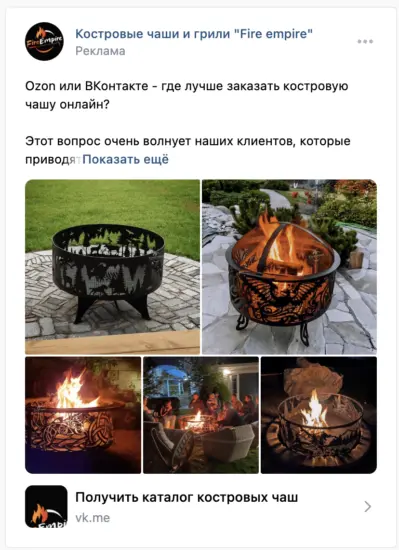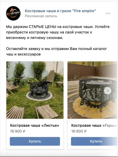 Ответы на эти вопросы мы узнали в ходе работы над проектом компании Fire Empire. Этот крупнейший в РФ производитель костровых чаш обратился к нам для настройки стабильного потока целевых лидов до 1000 рублей/штука. В ВКонтакте никогда не продвигались, заявки из нельзяграмма шли. Но, как вы знаете, он затух, а с него и поток лидов кончился.