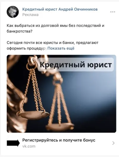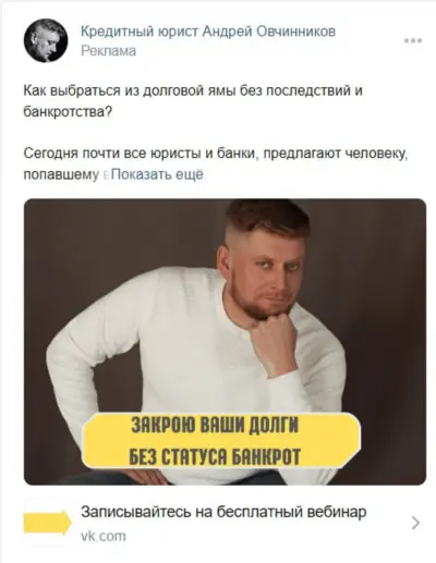 К нам обратился клиент Юрист Овчинников Андрей. У клиента Юридическая услуга для тех, у кого есть проблемы с кредитом, и кто не хочет/не может проходить процедуру банкротства. Данная услуга предоставляется два года.Преимуществом перед конкурентами является то, что продукт решает проблемы людей без негативных последствий.