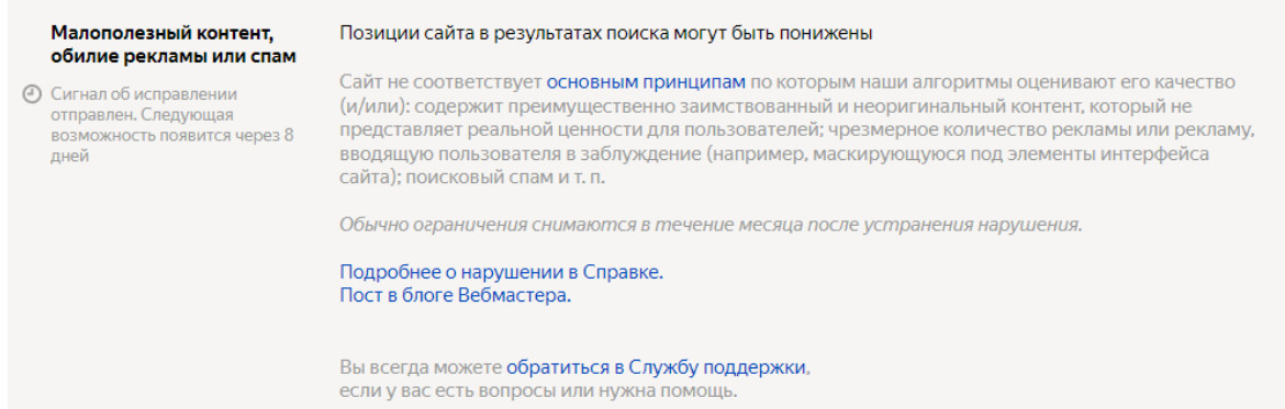 При этом важно понимать, что ваши действия могут и не принести никакого результата. Яндекс обещает снять ограничения в течение месяца после устранения нарушения. Но в действительности добиться ответа от поддержки или как-то ускорить проверку будет очень сложно.
