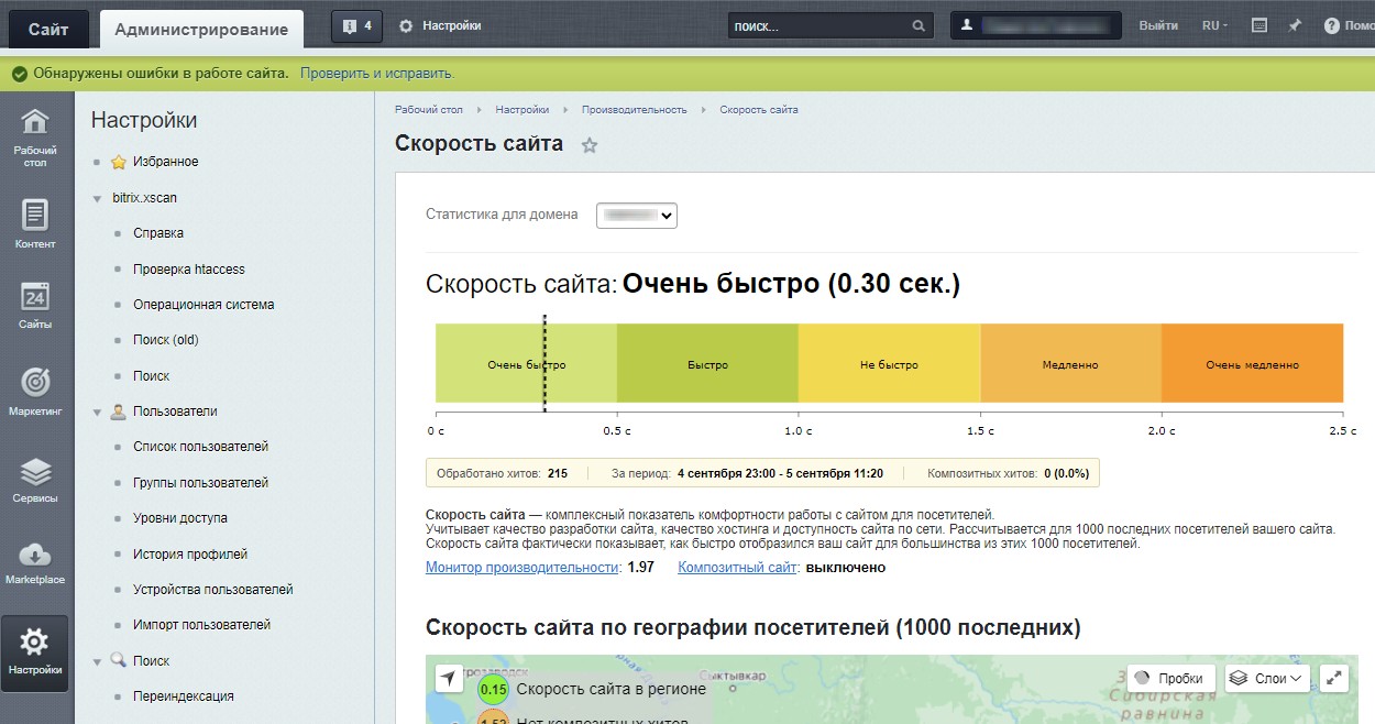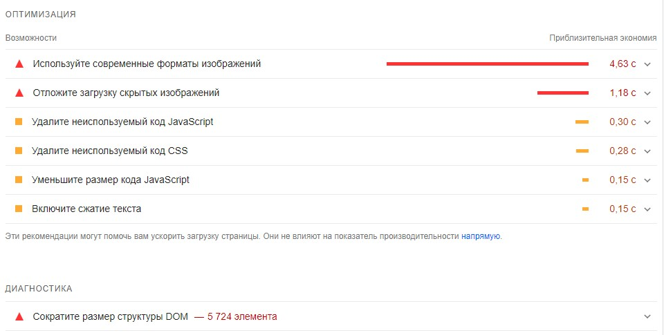 В Вебмастере можно увидеть быстроту загрузки страниц из мобильной выдачи Яндекс браузера в разделе Индекс скорости сайта. Если ресурс открывается долго, в сервисе появится сообщение. Яндекс.Метрика позволяет оценить некоторые показатели скорости загрузки в личном кабинете в разделе Отчеты → Мониторинг → Нагрузка на сайт. Здесь можно узнать показатели по этапам загрузки за определенное время, количество активных пользователей в выбранный период, количество просмотров страниц сайта и среднее число просмотров в минуту и т.д. Google дает намного больше информации о скорости загрузки: Для определения скорости загрузки можно воспользоваться одним из сервисов: gtmetrix, yellowlab, pingdom.com и т.п. Вот как выглядит оценка быстродействия на официальном сервисе PSI от Google. Для проверки введите в строку URL страницы и получите полный анализ. Статистика дается за предыдущие 28 дней. Каждый параметр оценивается отдельно от 0 до 100, потом выводится общий балл. Наглядно оценить изменение показателей и итоговой оценки можно с помощью калькулятора. После проверки страницы сервис PSI выдает рекомендации в разделах «Оптимизация» и «Диагностика». Красными треугольниками выделены серьезные проблемы, которые приводят к снижениям показателей, желтыми квадратами — небольшие неисправности, приводящие к средней скорости, а зеленым кругом — отсутствие проблем Также узнать скорость загрузки можно в административной части CMS. Вот так отчет выглядит в Битриксе. Приведем простые рекомендации по увеличению скорости. Сразу отметим, что большинство действий по оптимизации сайта требуют определенных знаний, как минимум гипертекстовой разметки HTML, и должны выполняться специалистами. Вот основные направления, на которые нужно обратить внимание, чтобы скорость загрузки вашего сайта не страдала. Общий размер всех запрашиваемых документов страницей не должен превышать 1600 КиБ. Иллюстрации отнимают много ресурсов при загрузке сайта. Чтобы избежать проблем, необходимо оптимизировать их, сохранив при этом качество. Сделать корректировку фото и картинок помогут следующие приемы: Также следует применить отложенную загрузку скрытых изображений. Так при открытии страницы прогружаться будут только те иллюстрации, которые попадают в зону видимости на экране пользователя. Настроить ленивую загрузку можно с помощью JS библиотек (lazyload, lazysizes, autoload и т.д.). Хранение данных в промежуточном буфере — кэше позволяет не обращаться каждый раз при запросе пользователя к серверу/хостингу, а брать сохраненную ранее информацию из этой памяти. Это как взять деньги из кошелька, который под рукой, и не тратить время на поход в банк за нужной суммой. Так страницы сайта загружаются быстрее. Выполнить настройки кэширования можно в админке сайта. Код страниц должен быть прописан корректно. Лучше если в нем не будет закомментированных кусков, устаревших тегов и конструкций. Это относится как к языкам гипертекстовой разметки — HTML, CSS, так и к языкам программирования JavaScript, PHP и т.д. Для проверки любого кода на наличие неактуальных элементов, которые в современных браузерах уже не используются, можно применять специальные сервисы, например jshint. Загружаете свой код, а программа находит ошибки и сообщает вам, где и что неверно. Для быстрой загрузки текстовой информации нужно настроить сжатие данных