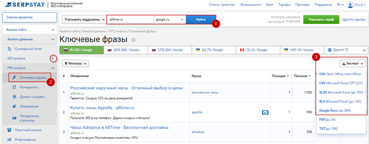 3. Учимся на чужих ошибках. Вот она вишенка на торте, которую все хотят слопать. Шпионя за компаниями бизнес-оппонентов, вы сможете наглядно увидеть ошибки, которые они допускают. Соответственно ваша фирма сможет исключить такие просчёты из своей рекламной кампании и использовать исключительно работающие механизмы продаж. Сразу скажем, что подобных сервисов достаточно много и работают они по схожему алгоритму. Поэтому мы выбрали 6 наиболее продвинутых и представляем их вашему вниманию: 1. SEMrush.Производит анализ конкурентов. Собирает информацию по ключевым словам с демонстрацией цен и рейтинга. А также имеет в арсенале множество других инструментов, помогающих в продвижении бизнеса; 2. Advodka. Быстро прогнозирует оценочный бюджет и трафик; 3. Serpstat.Качественный шпион за действиями конкурентов. Имеет большой набор инструментов для аудита; 4. SpyWords. Отлично работает с ключевыми запросами; 5. SpyFu. С помощью этого сервиса возможно увеличить трафик и привлечь новых клиентов на свой ресурс; 6. KeywordSpy.Довольно быстро сканирует рынок по ключевым запросам. Единственным недостатком является отсутствие русскоязычного интерфейса. В принципе каждый из вышеперечисленных сервисов обладает одним и тем же функционалом, но при этом сервисы имеют свои преимущества и недостатки. В идеале использовать пару из них или выбрать один, который устроит вас по всем параметрам. Как с ними работать мы покажем на примере Serpstat. Запускаем сервис и в его поисковую строку вставляем адрес сайта конкурента. Затем нужно перейти во вкладку «PPC-анализ» и далее в «Ключевые фразы». И вот оно — мы видим все ключевики, которые конкурент использует в контекстной рекламе. Экспортируем этот список в таблицу Excel. В данной таблице нам нужно будет оставить такие столбцы как: Позиция, Количество запросов и CPC (цена за клик). Теперь остаётся только посчитать, сколько конкурент тратит денег на рекламу. Для этого нам потребуется показатель CTR, который определяет кликабельность рекламы за определённый промежуток времени. На сервисе представлена собственная таблица приблизительных CTR, благодаря которой можно увидеть, как меняется показатель в зависимости от местоположения позиции. Позиция — CTR: 1 — 0,035 2 — 0,010 3 — 0,007 4 — 0,005 5 — 0,004 6 — 0,004 7 — 0,003 8 — 0,002 9 — 0,002 10 — 0,002 Далее необходимо добавить эти данные в нашу таблицу и задать формулу, которая выглядит следующим образом: Количество запросов * цена за клик * CTR = рекламный бюджет по выбранному запросу В итоге нужно сложить все полученные суммы по нашим запросам и — Вуаля! — получаем бюджет, который конкурент затратил в течение месяца. При этом мы ещё и увидим эффективность его рекламной кампании, а это нам тоже, ой как нужно. При составлении подобных моментов нужно ориентироваться не только на полученные цифры, но и учитывать другие важные факторы. Например: Дело в том, что любой сервис и поисковик выдаёт среднюю цену за клик и она может отличаться от реальной. Может быть, что конкурент переплачивает за клики, если его объявления не «цепляют» потенциальных клиентов или неточно соответствуют их запросам. Не слишком хороший пример для подражания. Можно потратить 100 000 рублей на клики и получить 1% конверсии, а можно и вложить 20 000, но иметь конверсию в 5%. Как так? Да, всё просто. На конверсию влияют многие факторы: от актуальности предложения до удобств