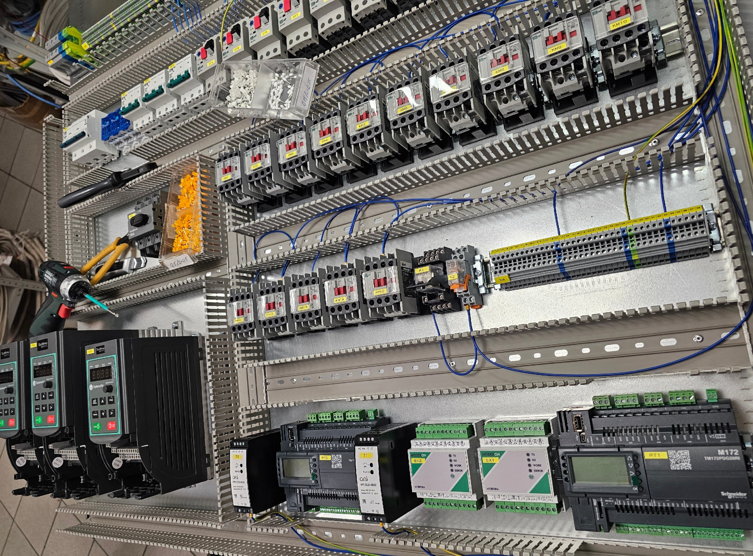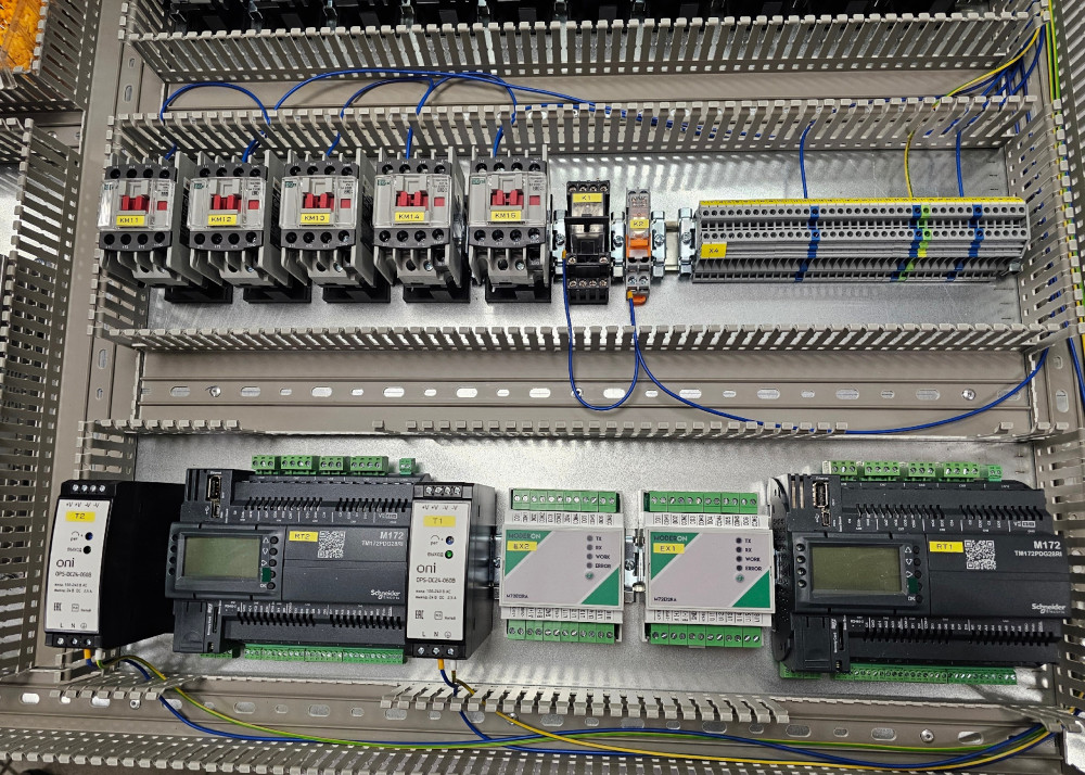 В щите управления наши партнёры использовали контроллер Schneider Electric, из-за дефицита комплектных модулей было принято решение использовать модули расширения нашего производства. Они управляются по шине RS485, протоколом Modbus RTU и могут применяться со сторонним контроллером, который поддерживает эту шину и протокол связи.