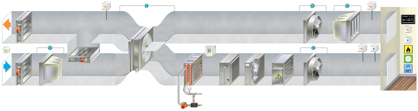 · Централизованные серверы на промышленных ПЛК — эти системы используются в крупных зданиях или объектах, где устанавливается централизованный щит управления (обычно в виде напольной стойки) на десяток или более систем вентиляции. Они включают в себя автоматику и программное обеспечение не только для управления системами вентиляции, но и аппаратно-программные средства для систем удаленного мониторинга и анализа работы (СКАДА системы).